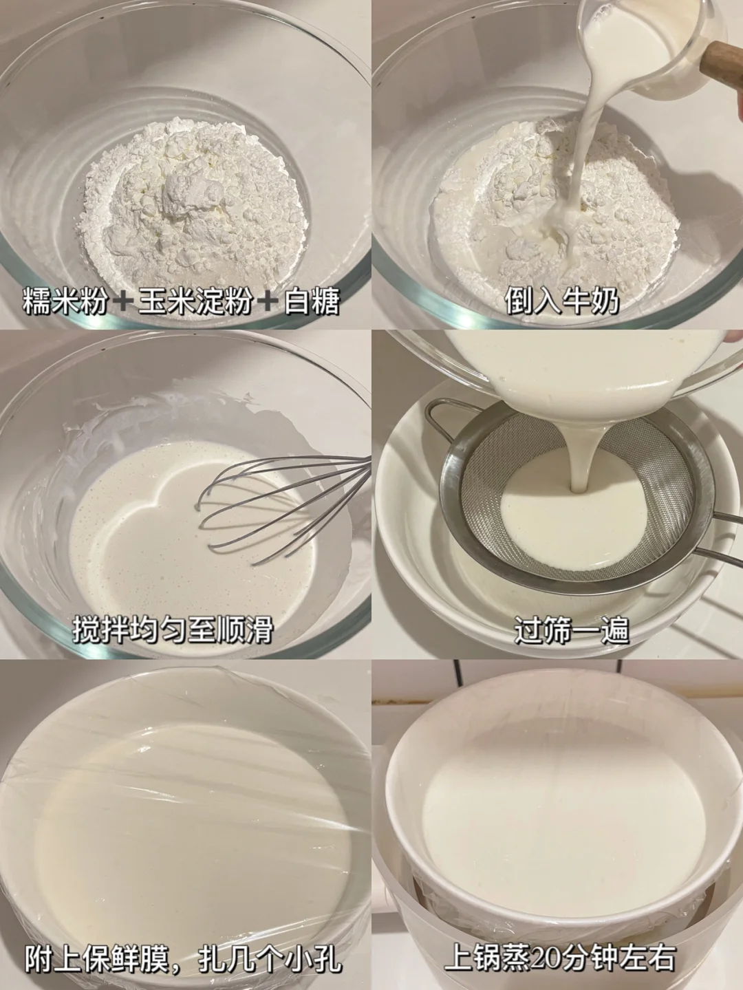 1⃣️糯米粉➕玉米淀粉➕白糖➕牛奶搅拌均匀至顺滑,过筛一遍,附上保鲜膜,扎几个小孔,上锅蒸20分钟左右。