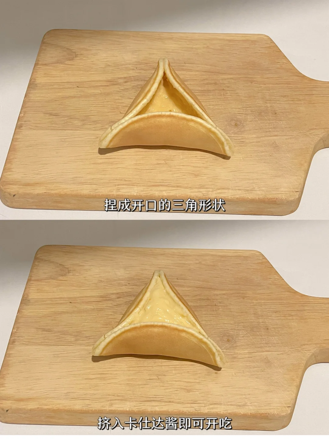 4⃣️将适量面糊倒入不粘锅中,小火加热至表面有小气泡后出锅,捏成开口的三角形,挤入卡仕达酱即可开吃。