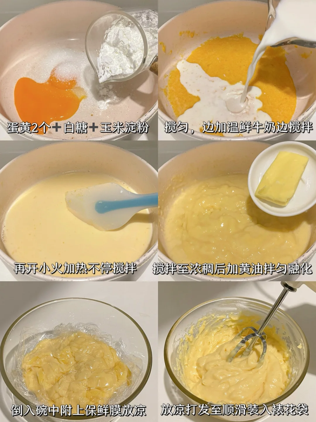 1⃣️蛋黄2个+白糖+玉米淀粉搅匀,边倒入温鲜牛奶边搅拌,再开小火加热不停搅拌至浓稠状,后加入黄油拌匀融化。