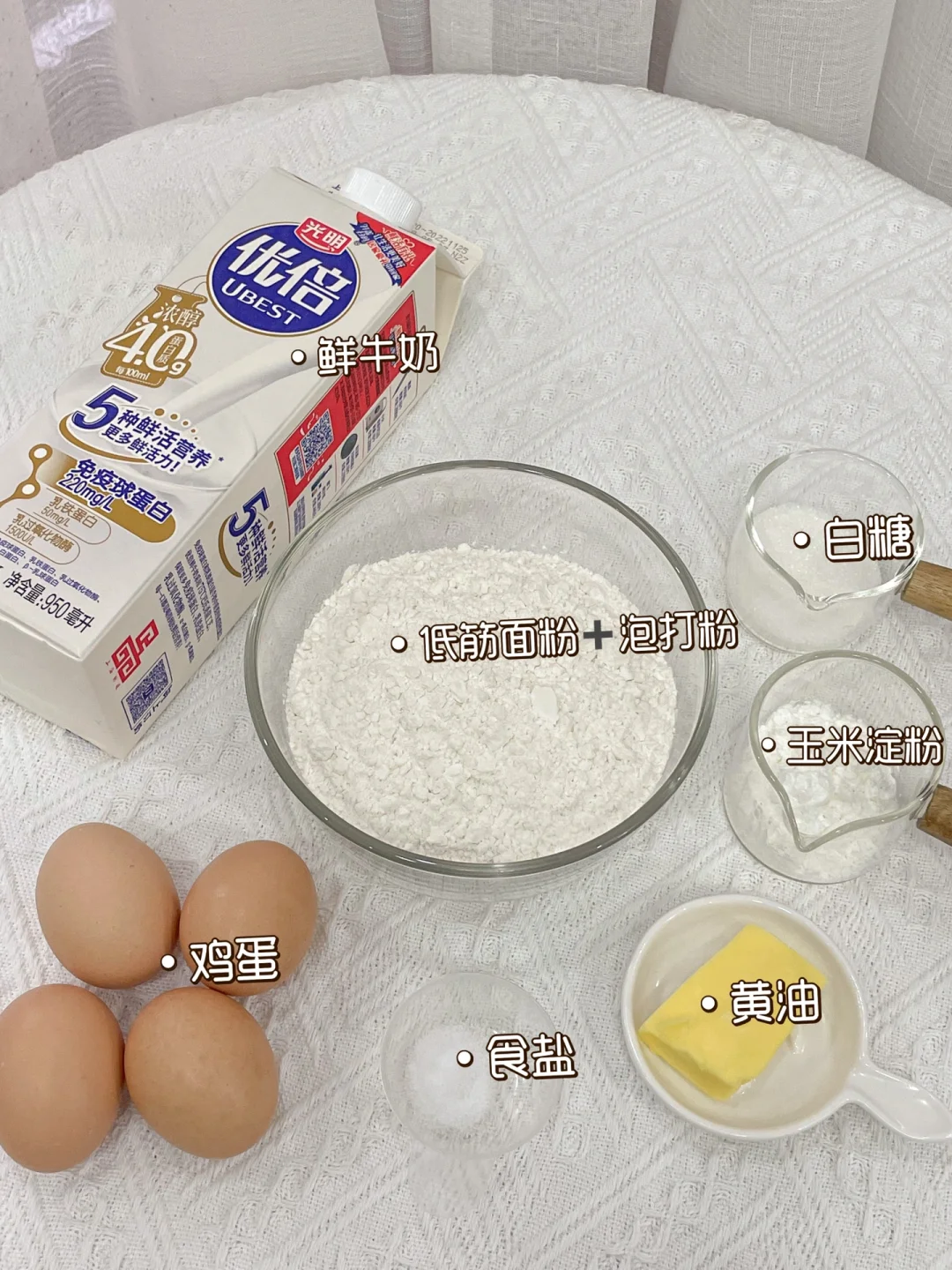 松饼:鸡蛋2个、白糖35g、食盐2g、鲜牛奶200g、低筋面粉200g、泡打粉8g