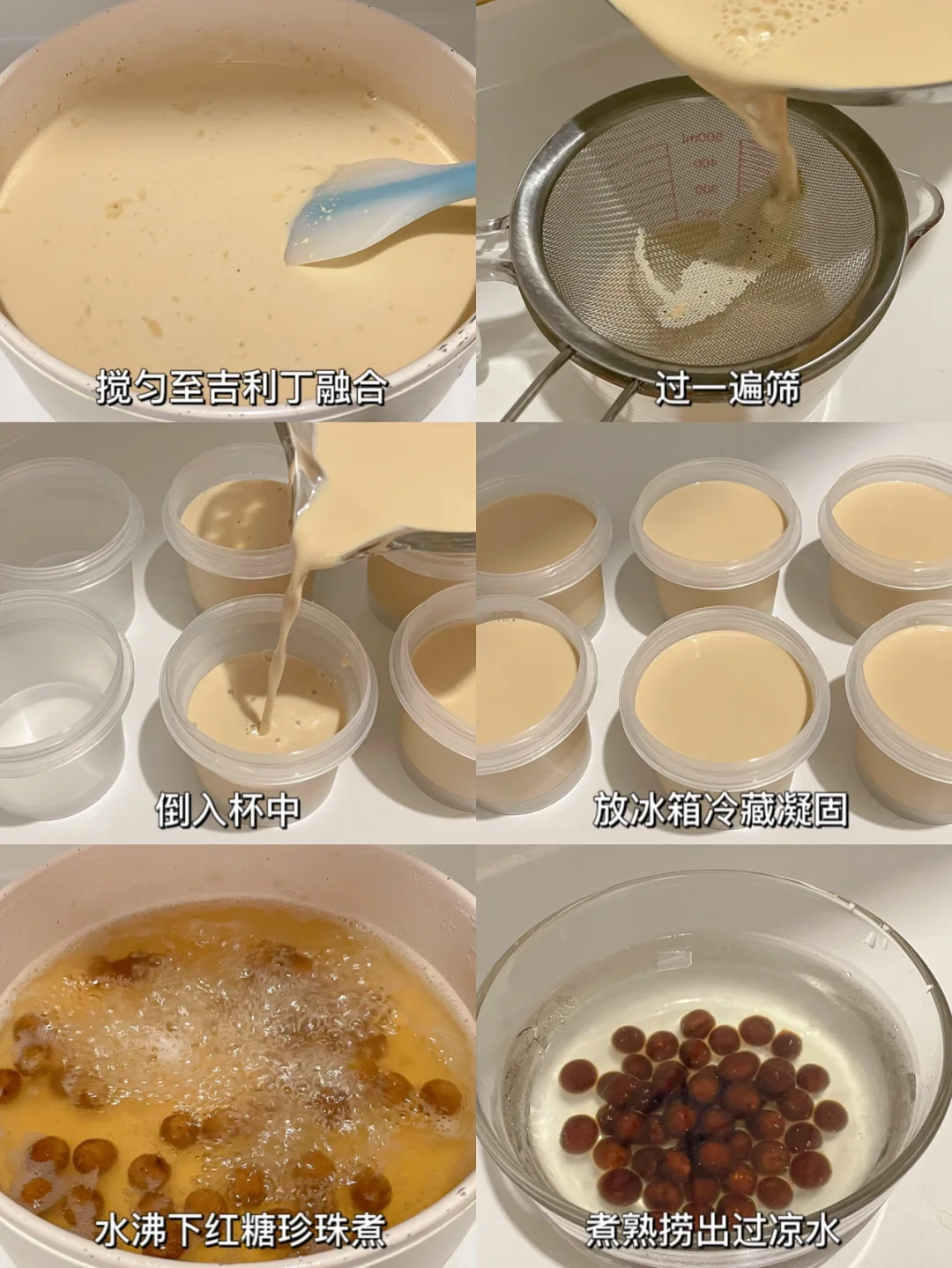 3⃣️水沸下红糖珍珠,煮至浮起煮熟,煮熟后捞出过凉水。将珍珠放在凝固的奶茶冻上即可。