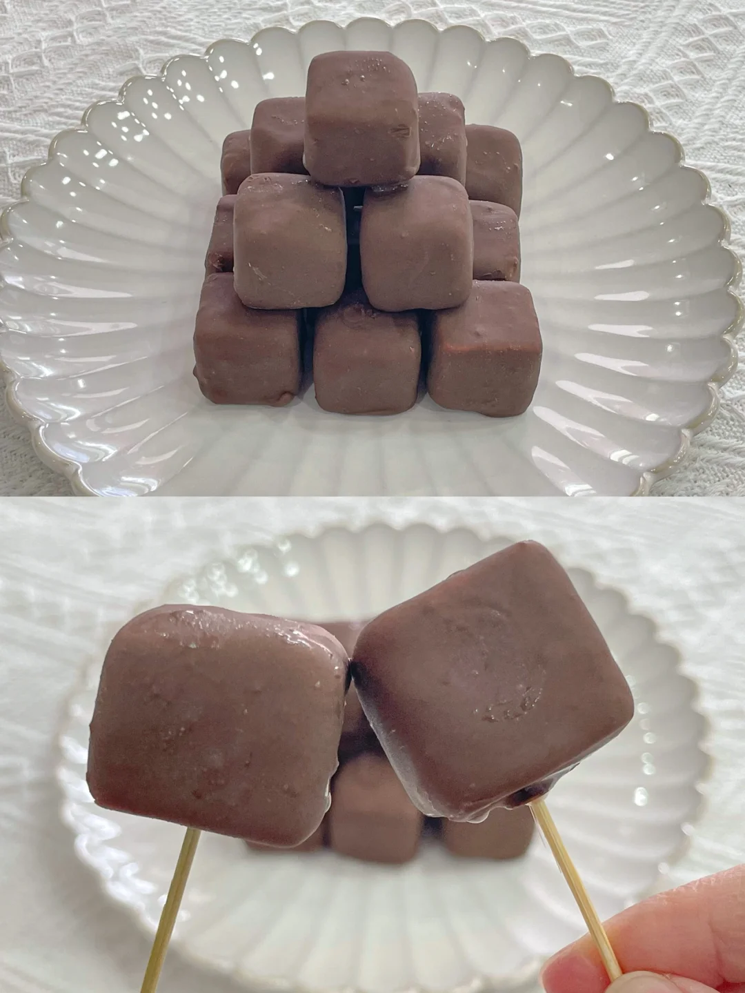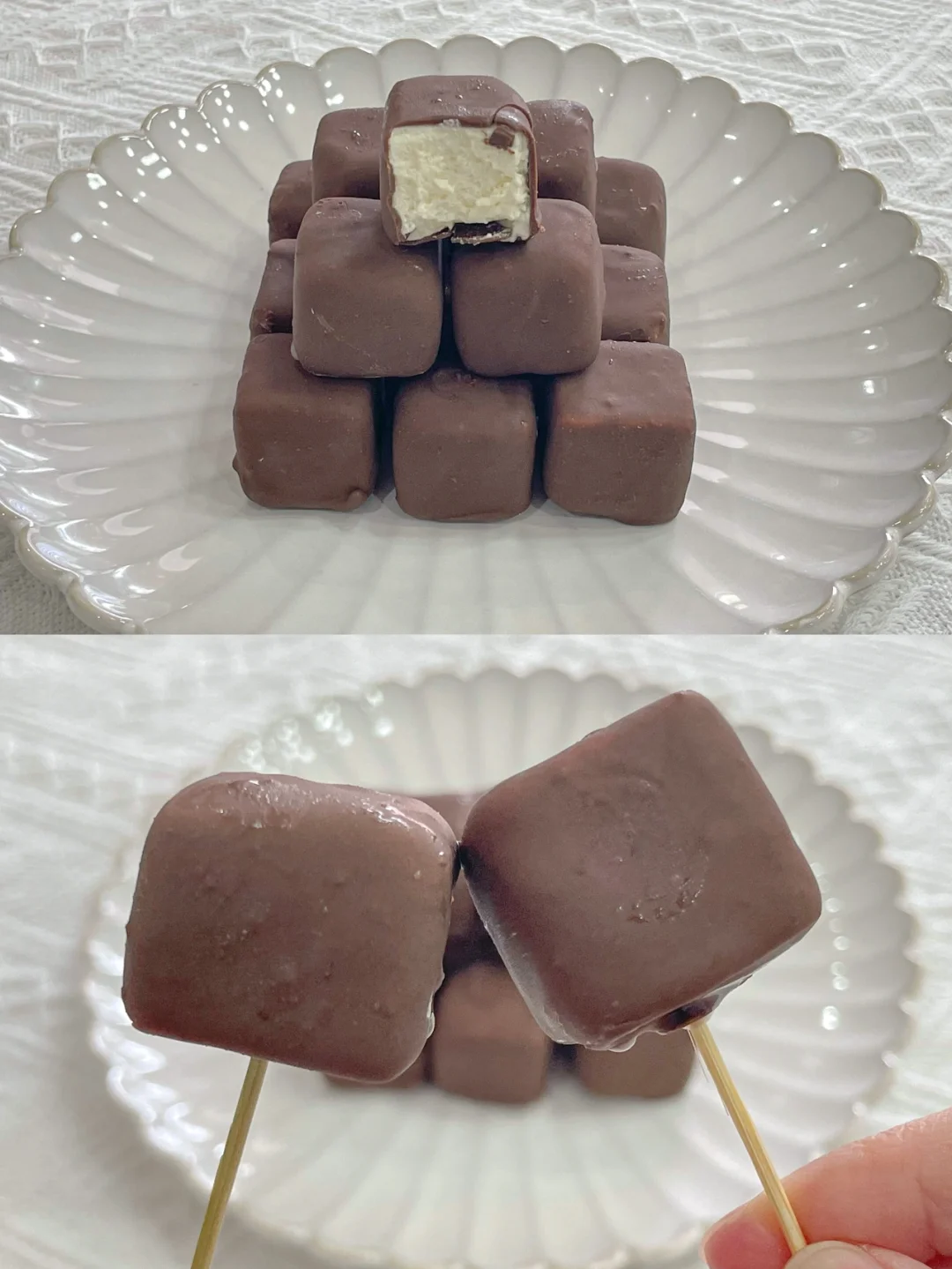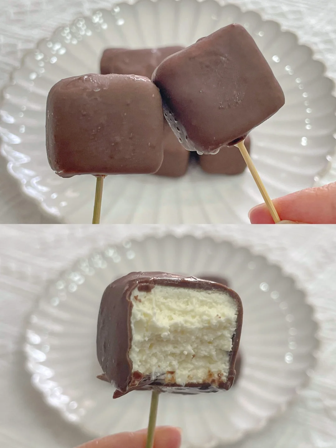 3⃣️脆皮巧克力酱隔热水融化,冷冻好的雪糕取出裹一层脆皮,再放冰箱冷冻1个小时后取出即可开吃。