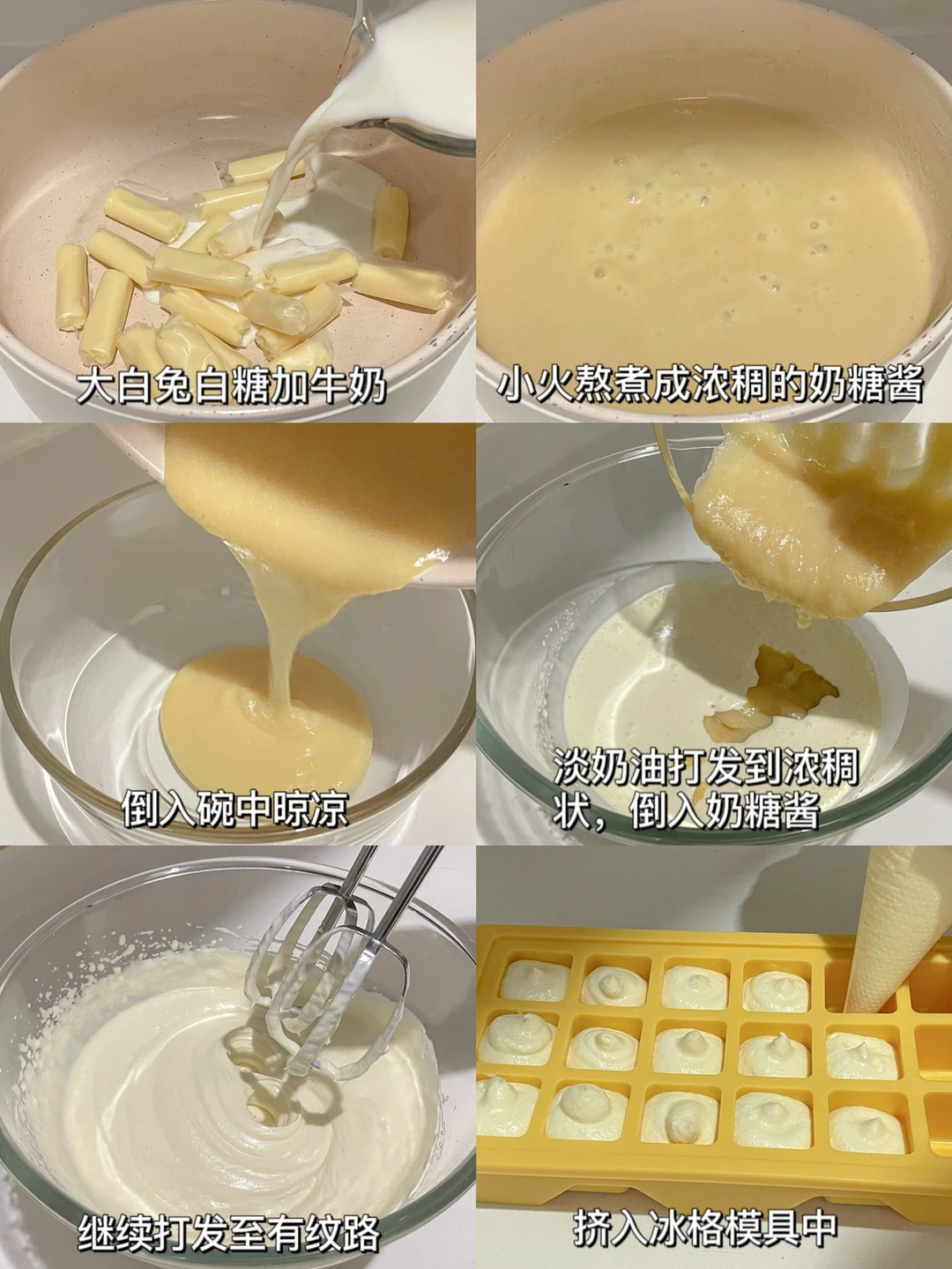 1⃣️锅中大白兔奶糖加牛奶,小火加热搅拌熬煮至浓稠的奶糖酱,倒入碗中晾凉备用。