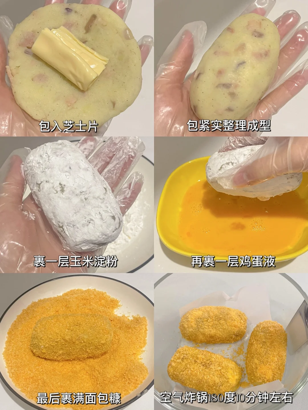 4⃣️表面依次裹满玉米淀粉、鸡蛋液和面包糠。