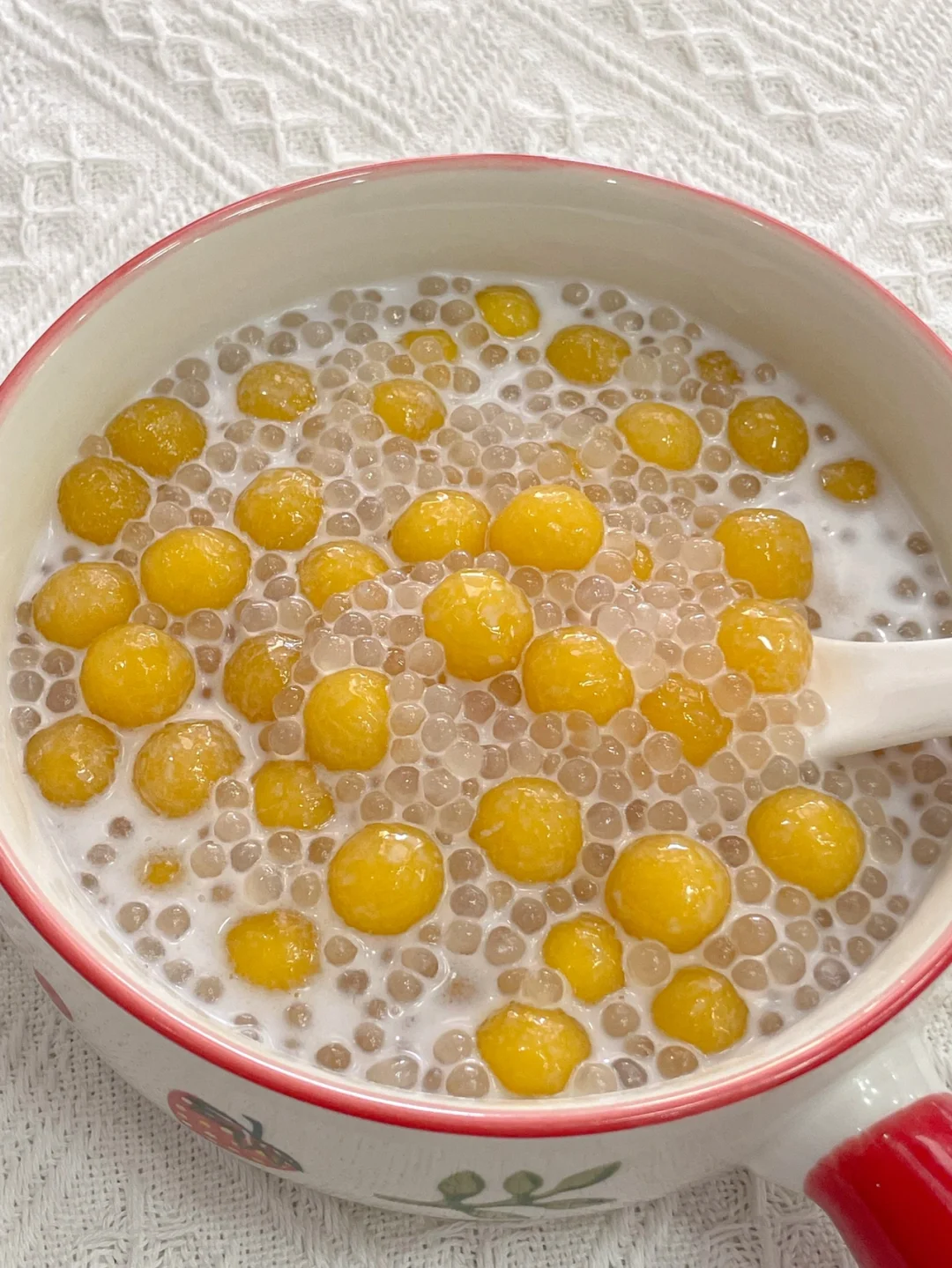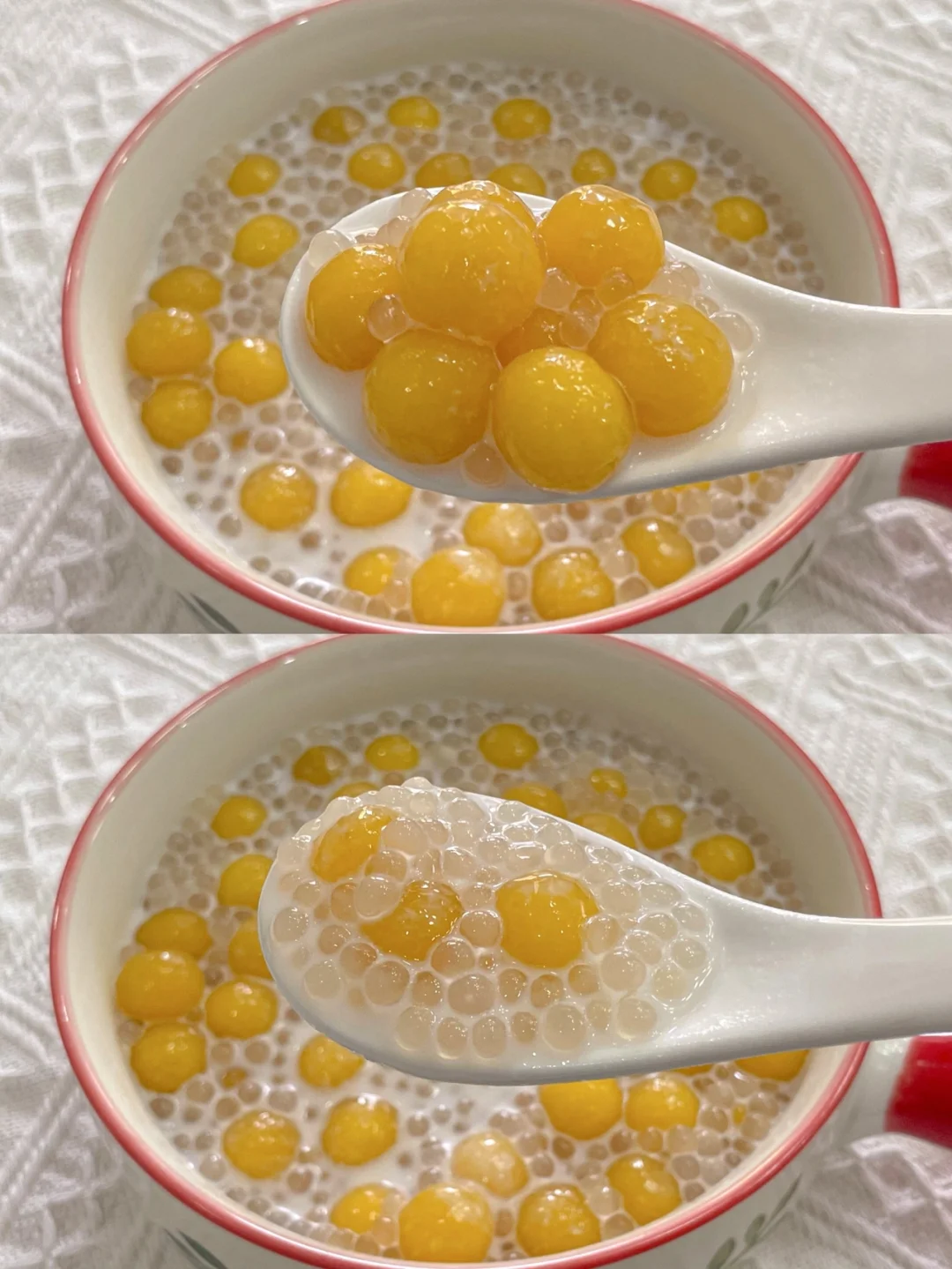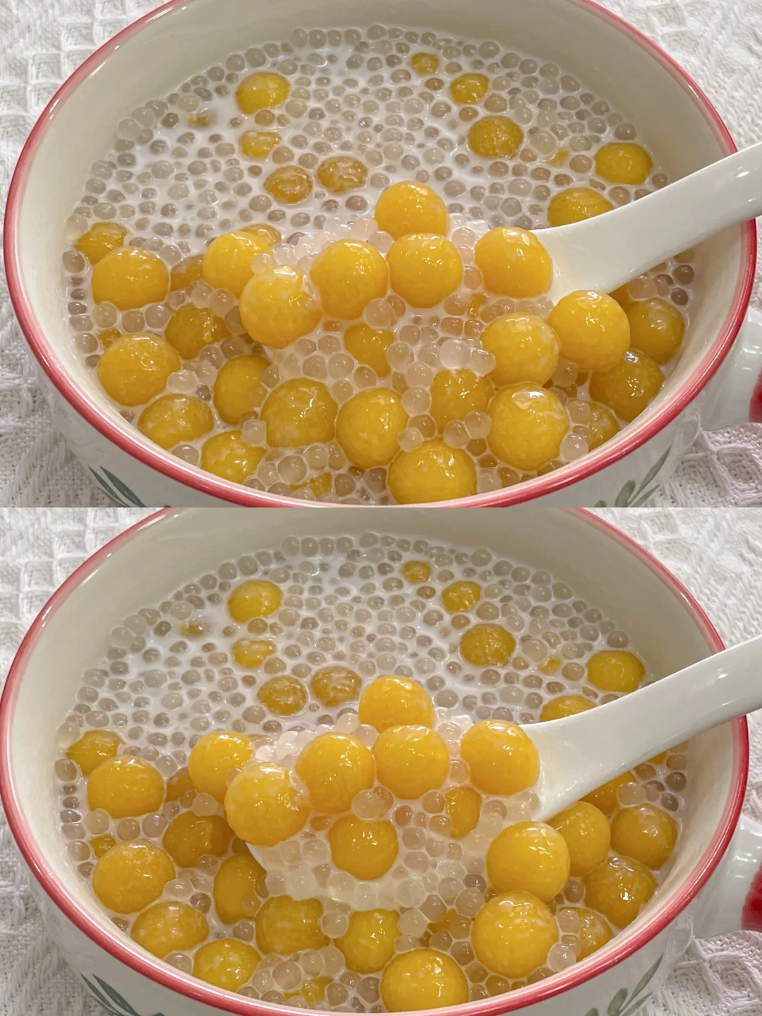 5⃣️碗中加芒果啵啵和西米,倒入椰奶,搅拌一下即可开吃。