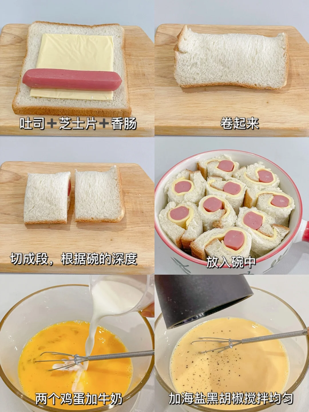 1⃣️吐司上依次放芝士片和香肠,卷起来,切成断后放入碗中。