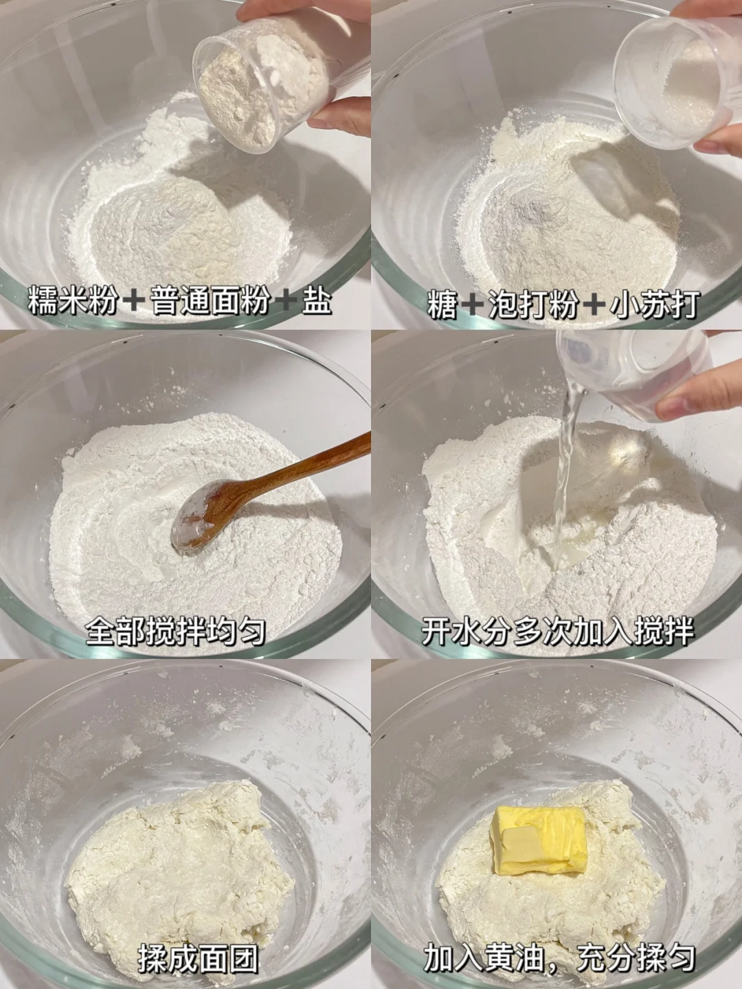 1⃣️糯米粉+普通面粉+盐+糖+泡打粉+小苏打,全部混合搅拌均匀,再分多次加入开水并搅拌,揉成面团。