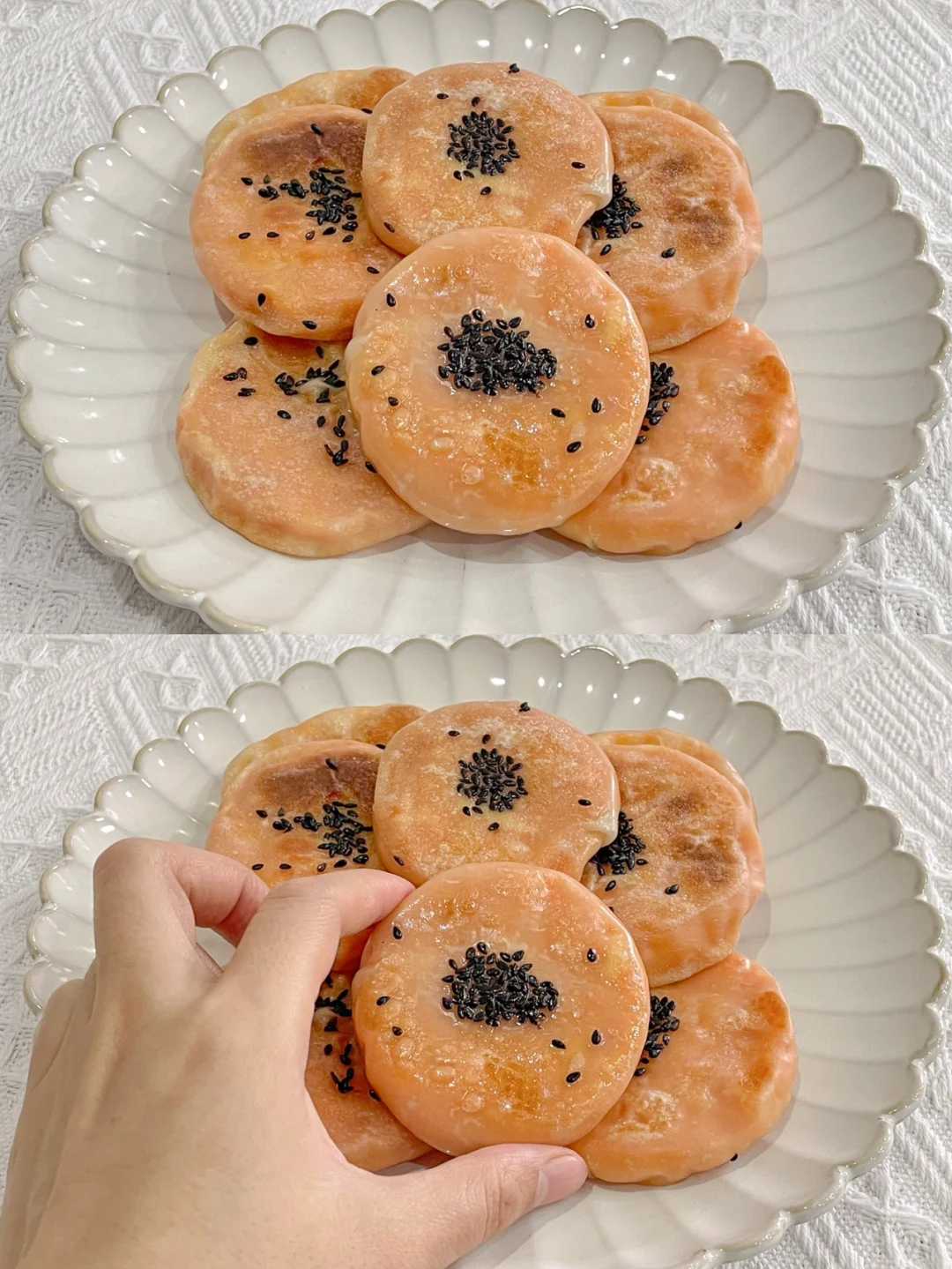 4⃣️锅中刷上少量的油,放入红薯饼,在饼中间蘸水,撒上黑芝麻,翻面煎至微焦,两面都需煎焦黄后即可出锅。