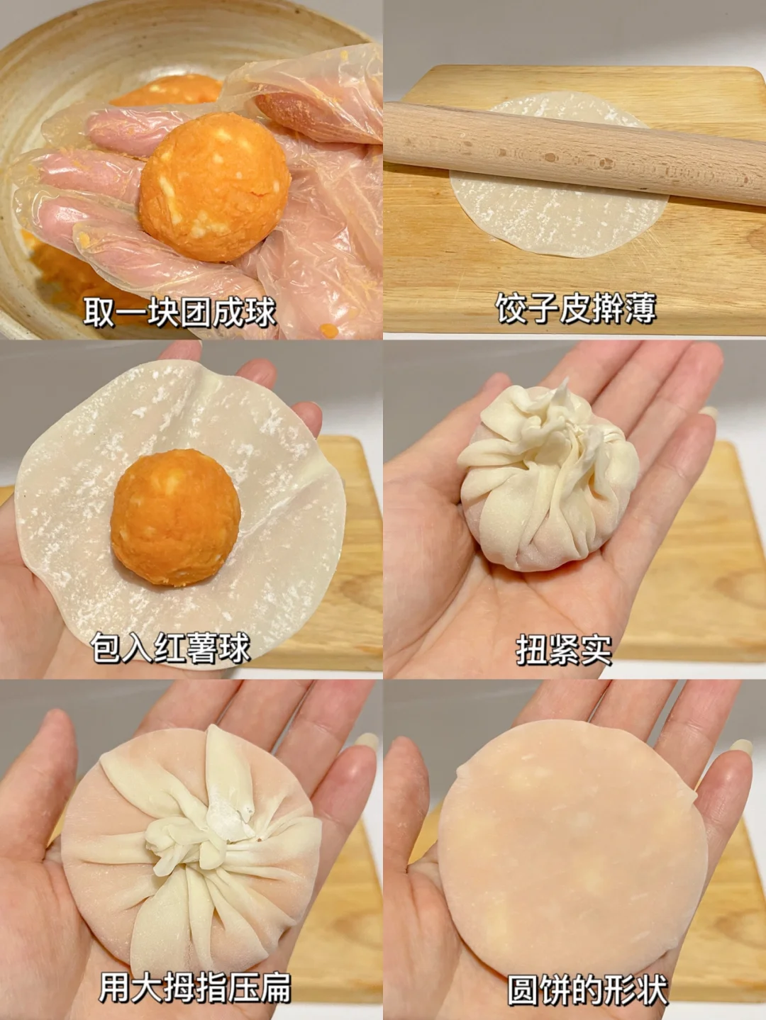 3⃣️将饺子皮擀薄,包入红薯球,捏紧实,用大拇指压扁,就成了圆饼状。