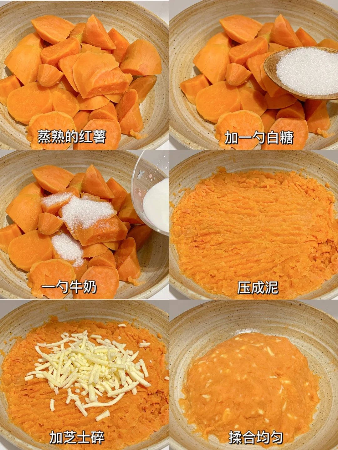 1⃣️红薯洗净去皮切成小块,上锅蒸熟后加一勺白糖和一勺牛奶,将红薯压成泥。
