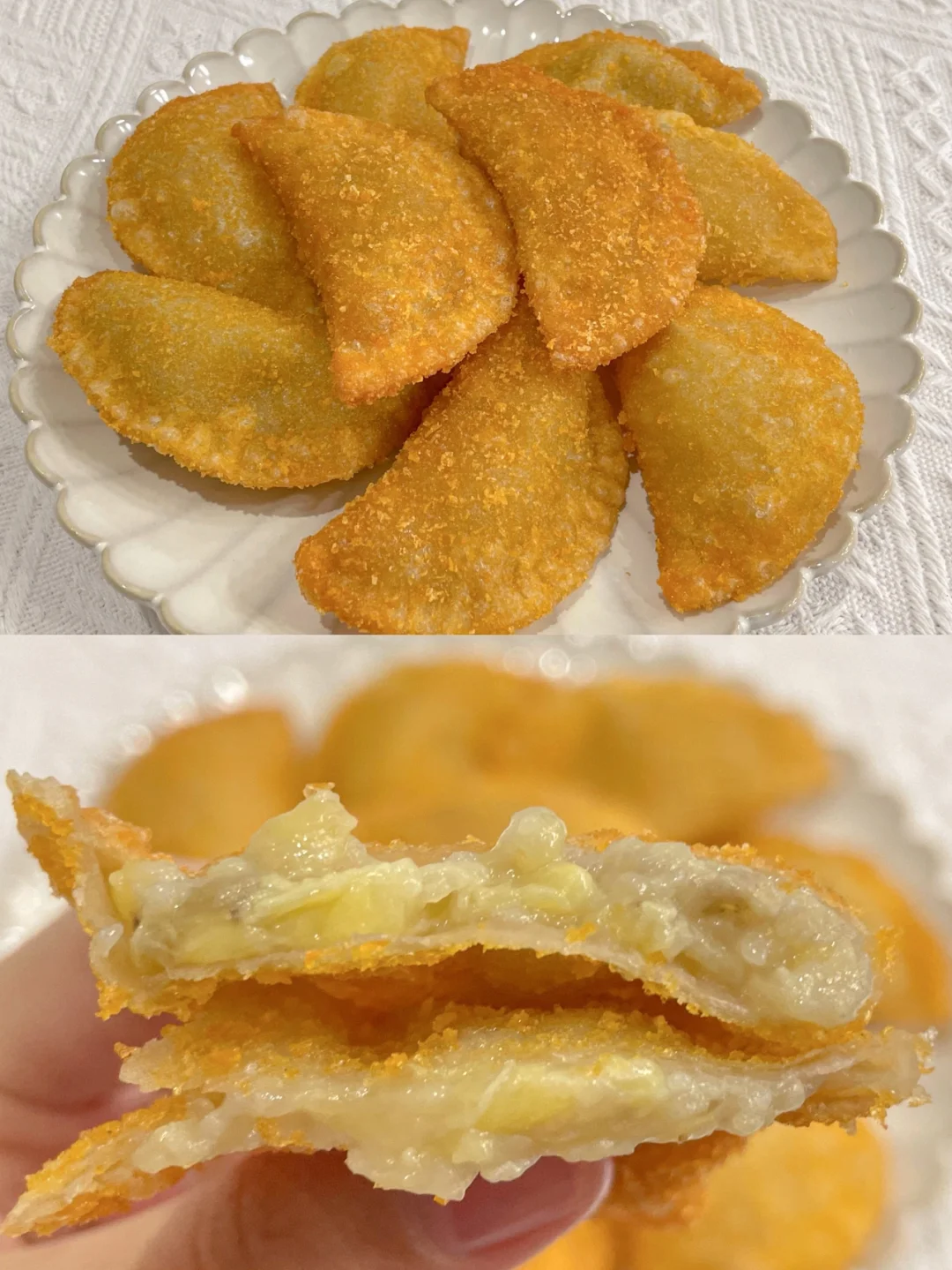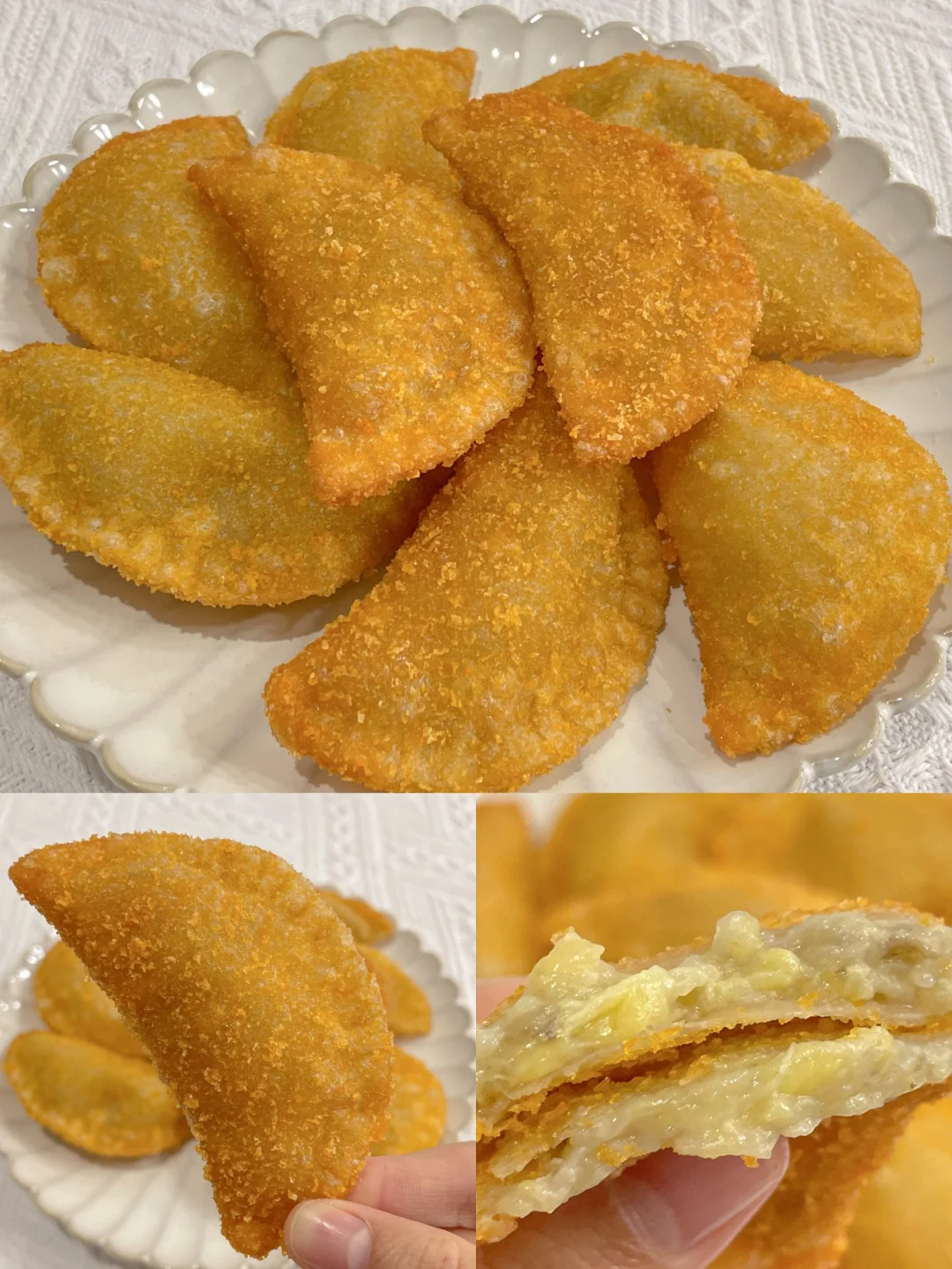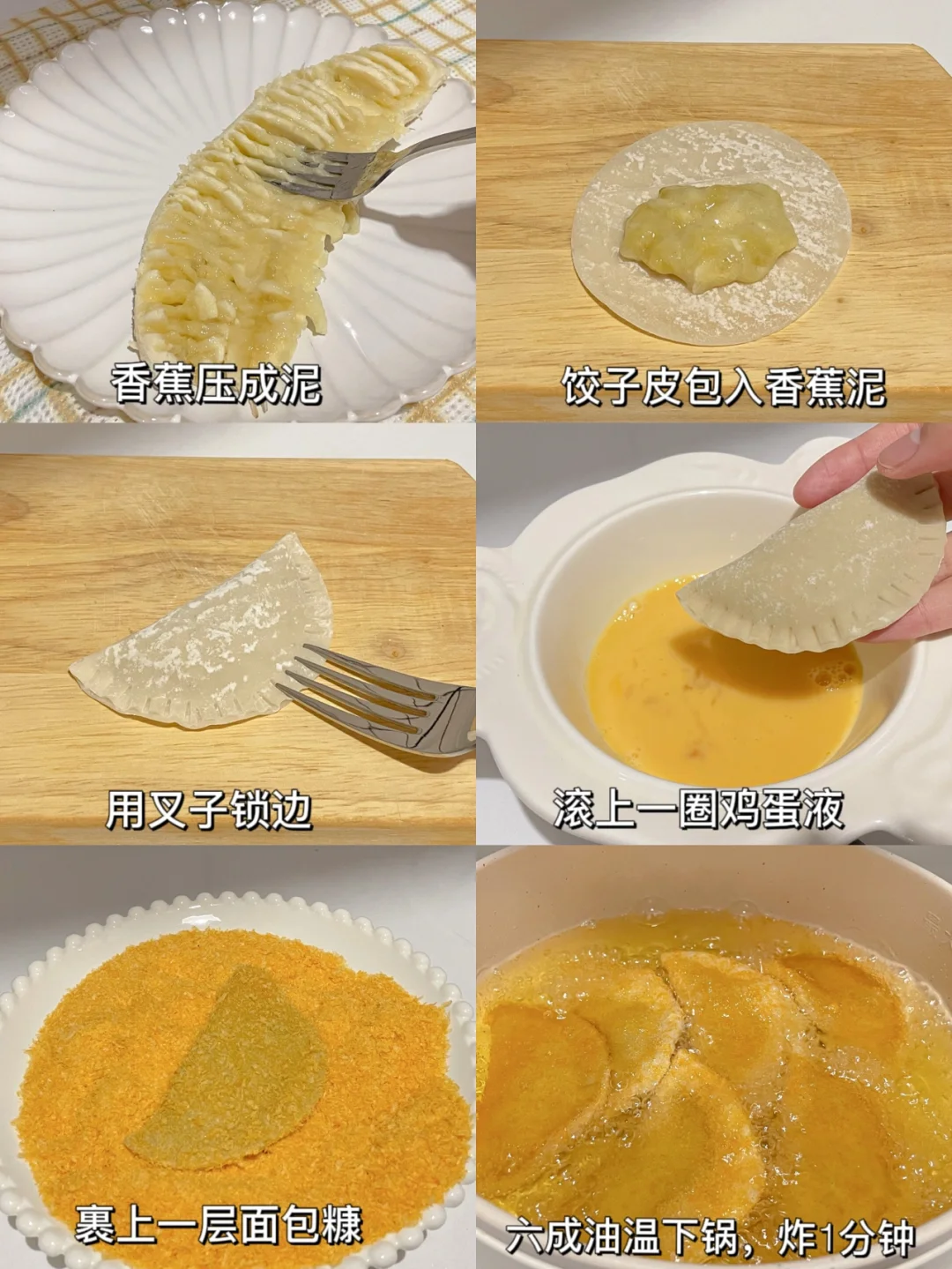 又香甜又酥脆的香蕉派,大人小孩都爱吃~[派对R][派对R] 免烤箱,做法超简单,喜欢赶紧试试哦~[吐舌头H][吐舌头H] 🌈食材: ✔️香蕉 ✔️鸡蛋 ✔️面包糠 ✔️饺子皮 🌈做法: 1⃣️把香蕉压成泥,用饺子皮包上香蕉泥,拿叉子封边。 2⃣️在鸡蛋液中滚一圈,再裹上面包糠。 3⃣️锅中六成油温下锅,速炸1分钟捞出即可。