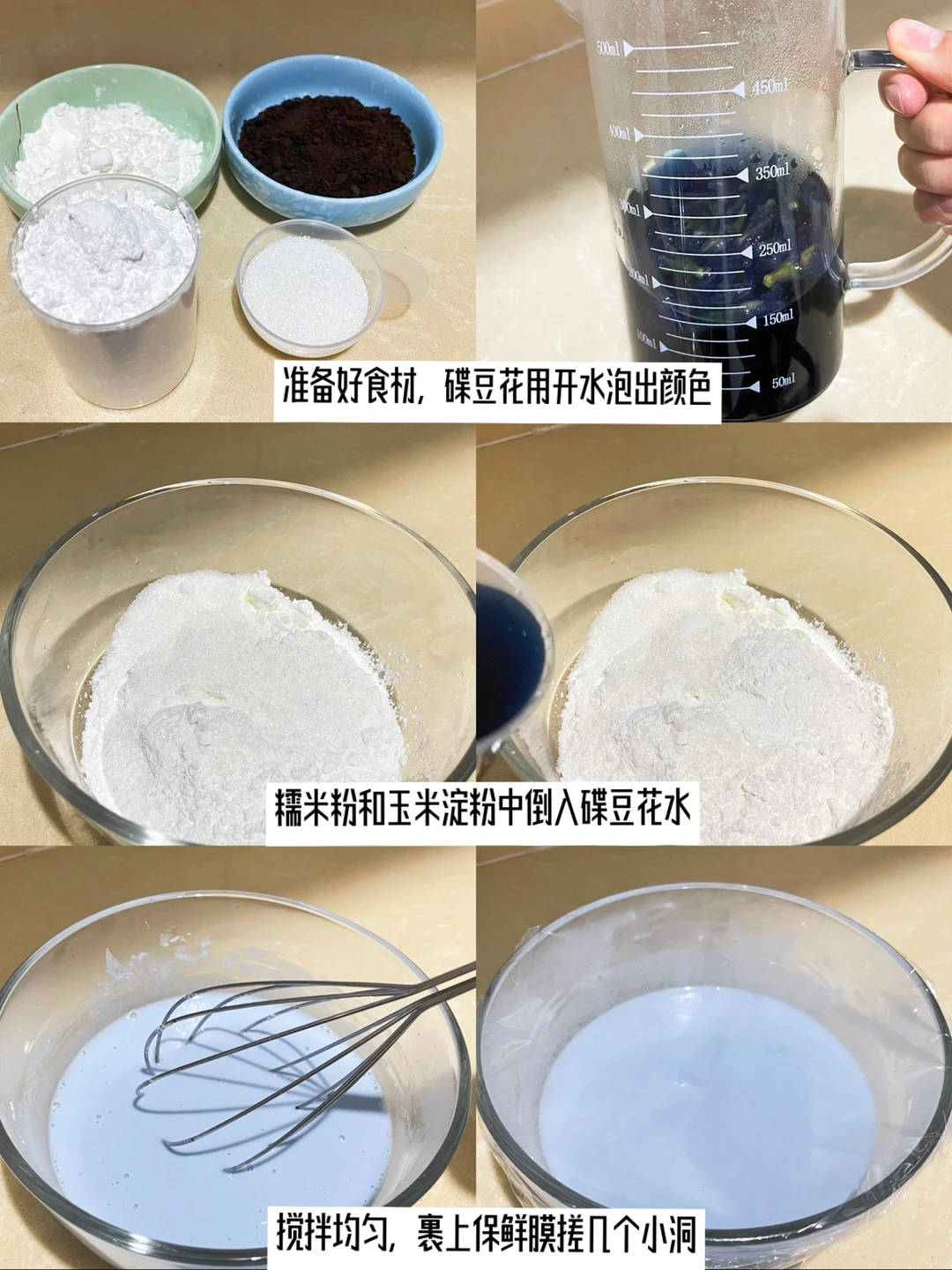 糯米粉50g+玉米淀粉15g+白糖15g+蝶豆花水85g,搅拌均匀,过筛一遍。