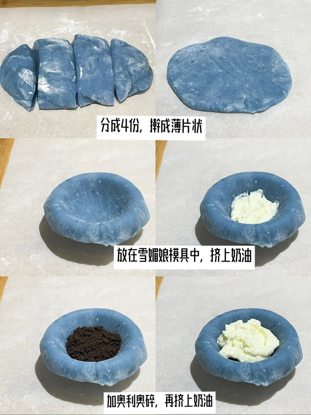 撒上熟糯米粉,分成4份,擀成薄片状,挤上奶油,加奥利奥碎,再挤上奶油,收口包好,抹点熟糯米粉即可。