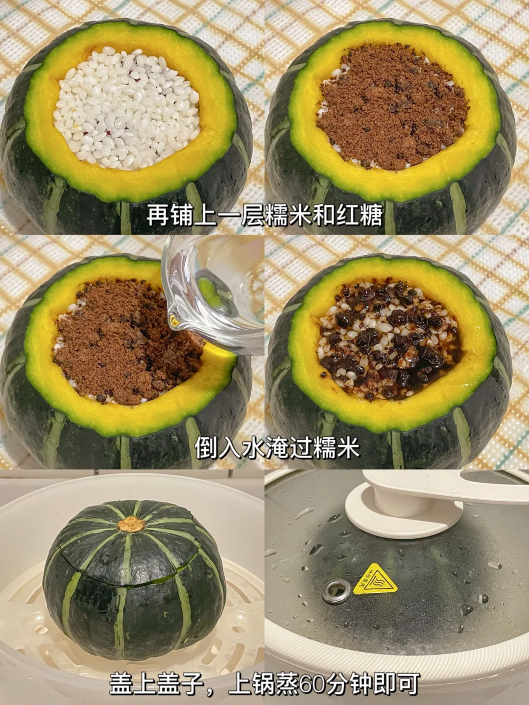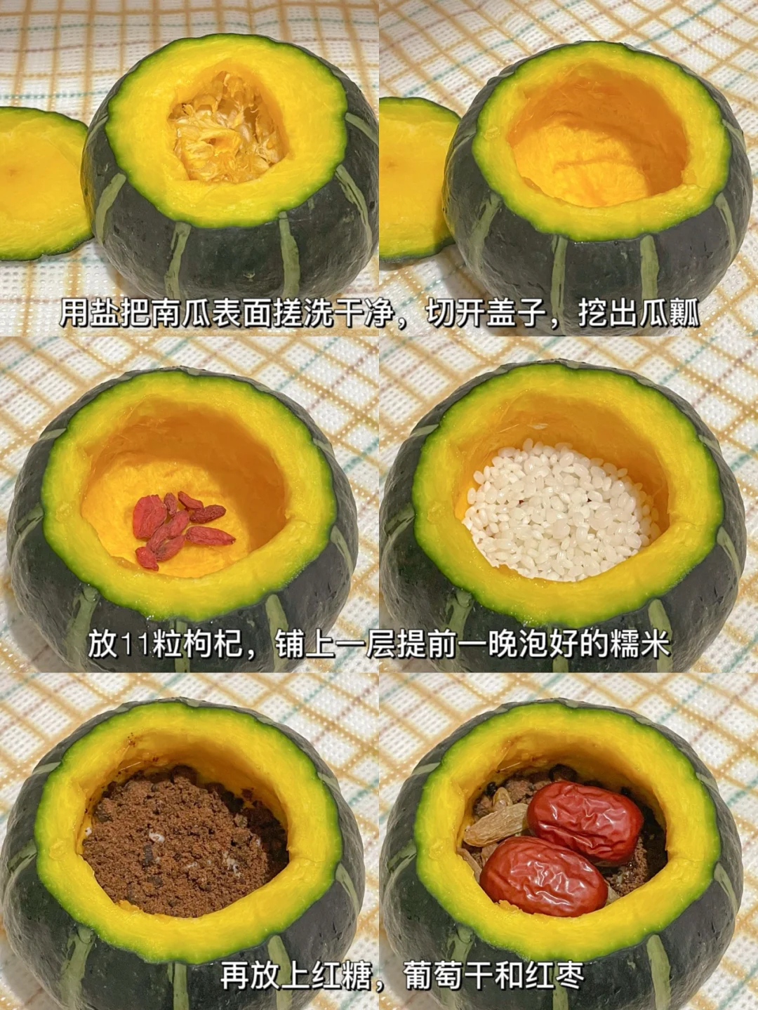 软糯香甜,大人小孩都超爱吃哟~[赞R][赞R] 🎃食材: ✔️贝贝南瓜 ✔️糯米 ✔️枸杞 ✔️红糖 ✔️红枣 ✔️葡萄干 🎃做法: 1⃣️用盐把南瓜表面搓洗干净,切开盖子,挖出瓜瓤。 2⃣️放入11粒枸杞,铺上一层糯米,再放上红糖、葡萄干和红枣,继续再铺上一层糯米和红糖,倒入水淹过糯米。(❗️❗️糯米一定要提前一碗泡好,否则会不熟哦❗️❗️) 3⃣️盖上南瓜盖子,上锅整60分钟即可。