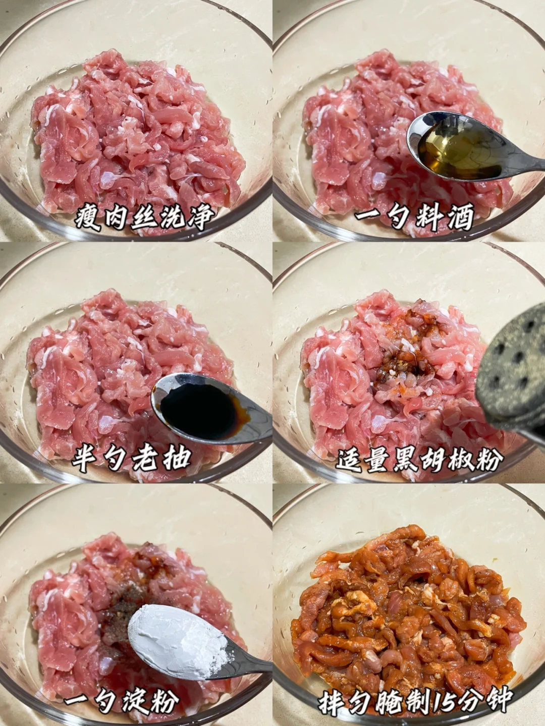 1⃣️瘦肉丝洗净,一勺料酒➕半勺老抽➕适量黑胡椒+➕一勺淀粉,抓匀腌制15分钟。