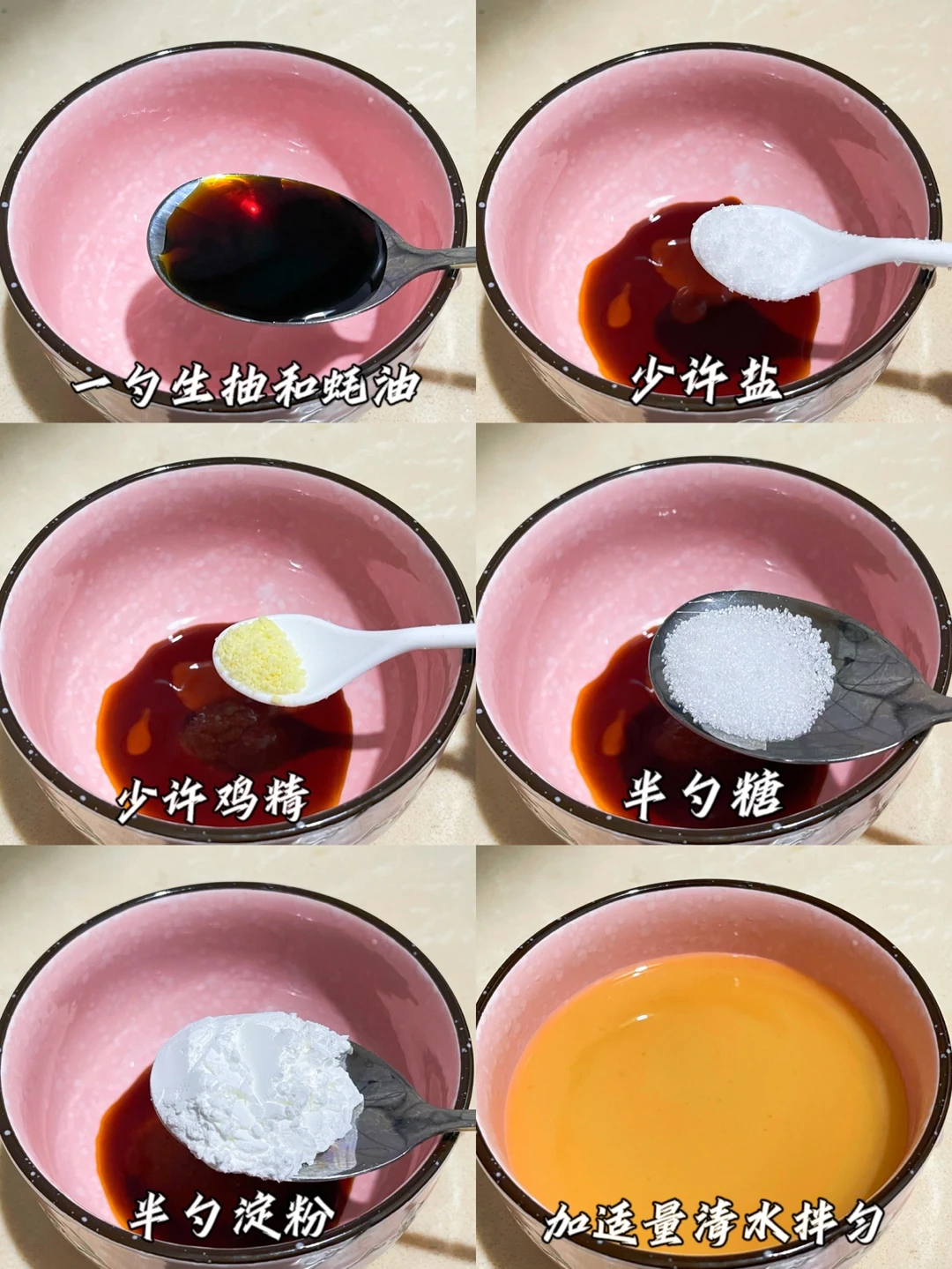 2⃣️调料汁:一勺生抽➕一勺耗油➕少量盐和鸡精➕半勺糖➕半勺淀粉➕适量清水,拌匀即可。