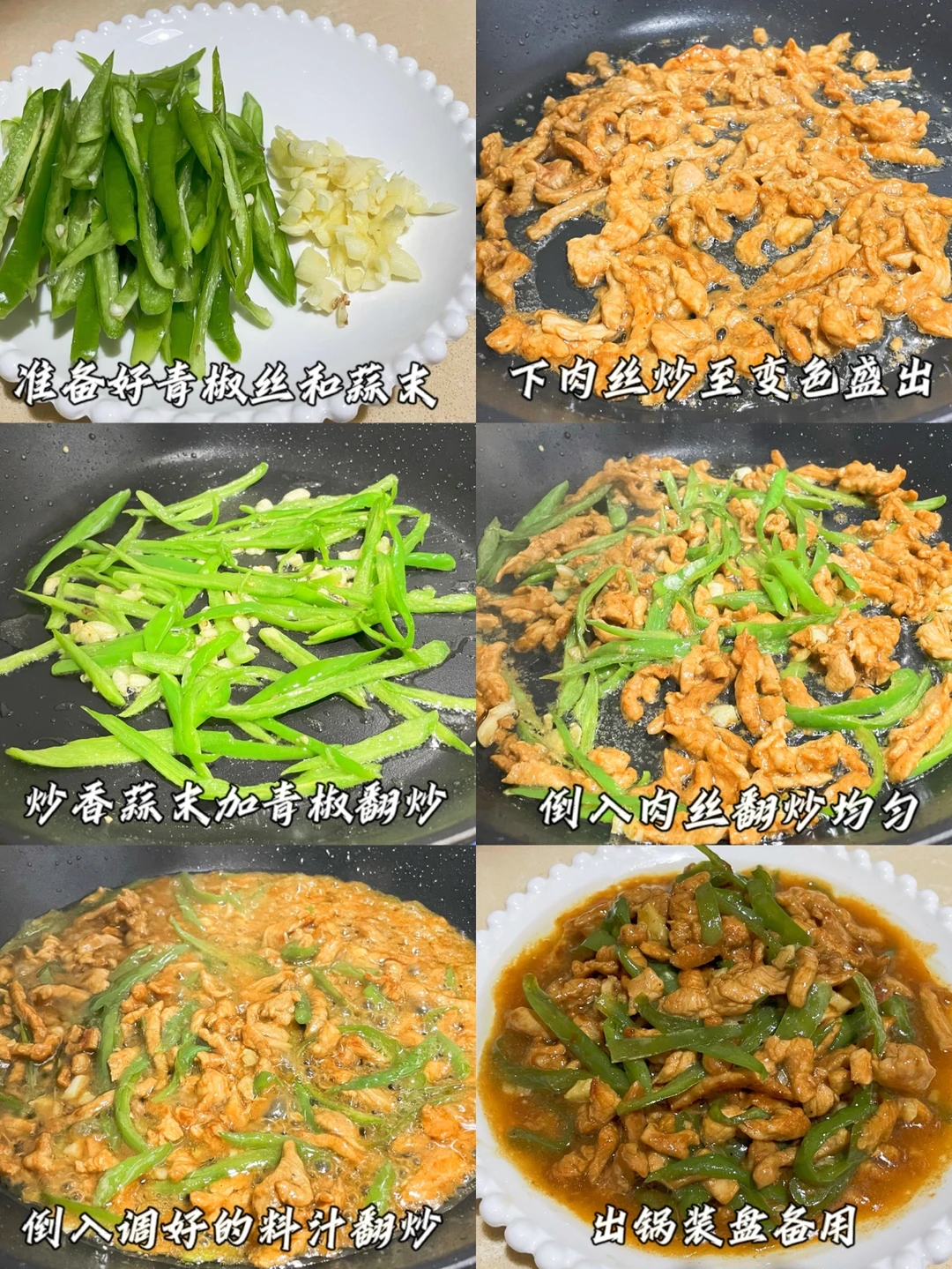 3⃣️肉丝炒至变色盛出备用,再炒香蒜末,下青椒丝炒断生,放入肉丝炒匀,倒入料汁炒至浓稠。