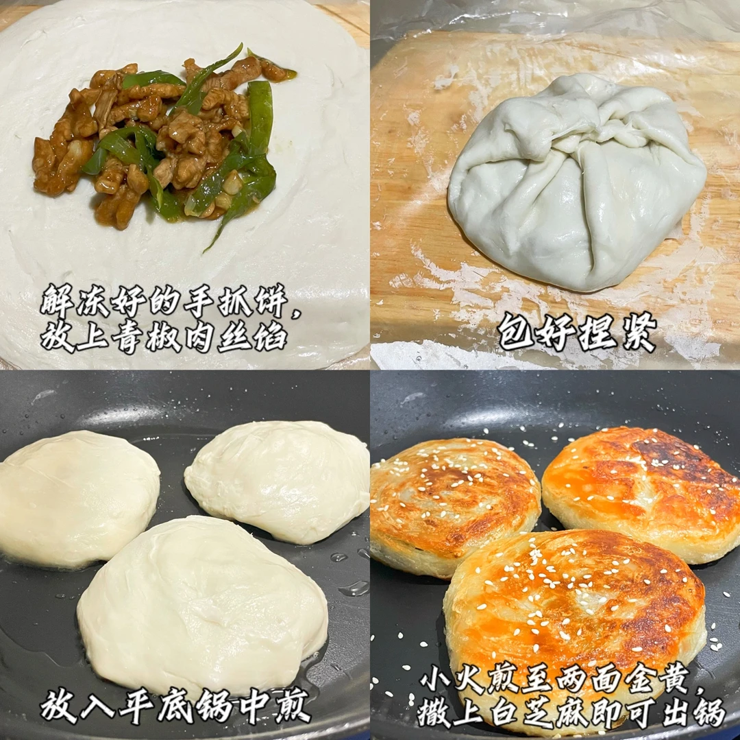 4⃣️手抓饼解冻,放入青椒肉丝包紧,平底锅小火煎至两面金黄,撒上白芝麻即可出锅。