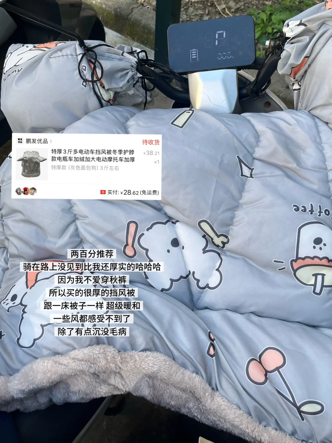 写写这段时间买的 都是精挑细选,非常满意嘿嘿 顺便附上打工人冬天骑电动车三件套 劝各位速速入手