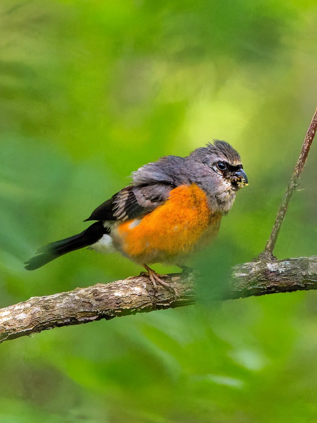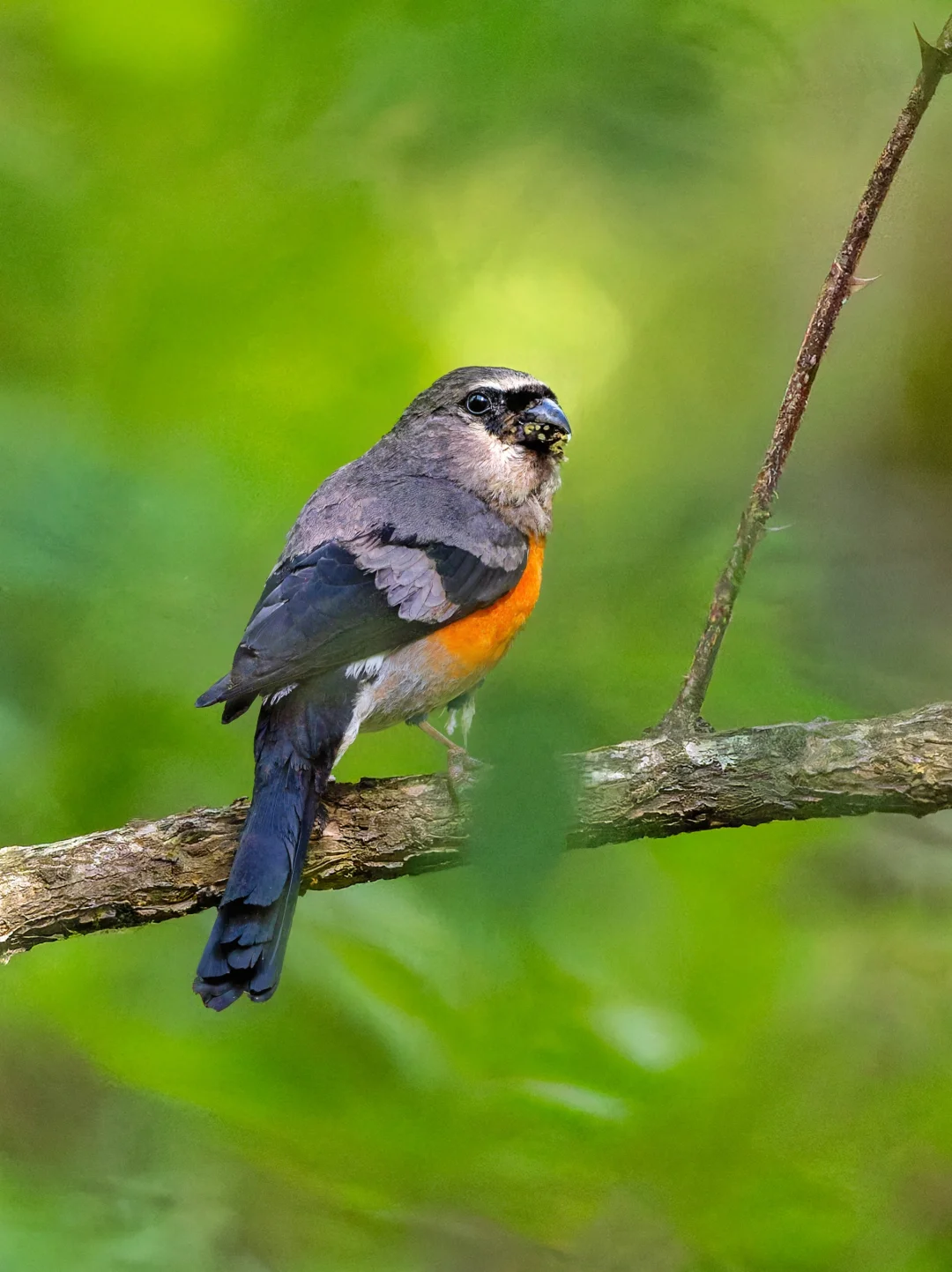 原创拍摄于2025.08 灰头灰雀,Grey-headed Bullfinch,雀形目燕雀科灰雀属。分布在喜马拉雅山脉一直延伸到我国中部的高山针叶林和混交林。 灰头灰雀雌雄颜色不同,雄鸟胸部是橙色,与珍珠灰色的体羽形成鲜明的撞色。雌鸟就没有撞色啦。另外它们额部至眼后下巴形成一个黑色的三角形区域,像是戴一个面罩。 灰头灰雀听名字看上去朴实无华,实则鲜艳骚气。到西部高山上观鸟还是挺常见的。