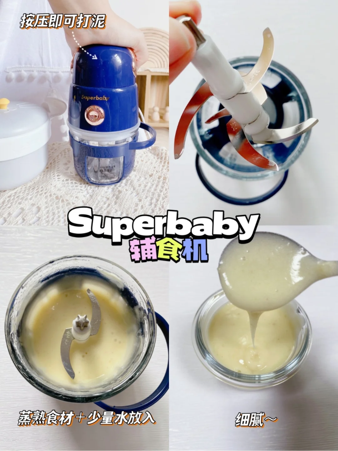 ③不同辅食机操作方式不同,之前用过一款自动打泥的,需要设置预定时间,打一次泥将近15分钟[失望R]后来用的这款只要通电后,用手按压盖子就可以开始打泥,松手后即停止,十几秒就能打出细腻的辅食泥啦!