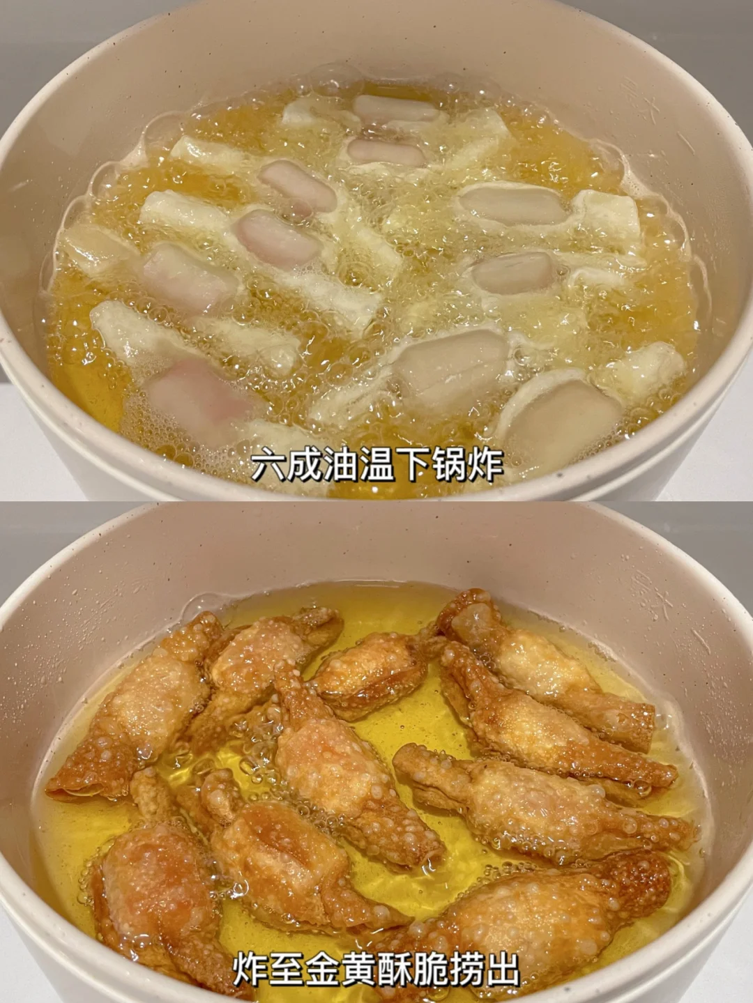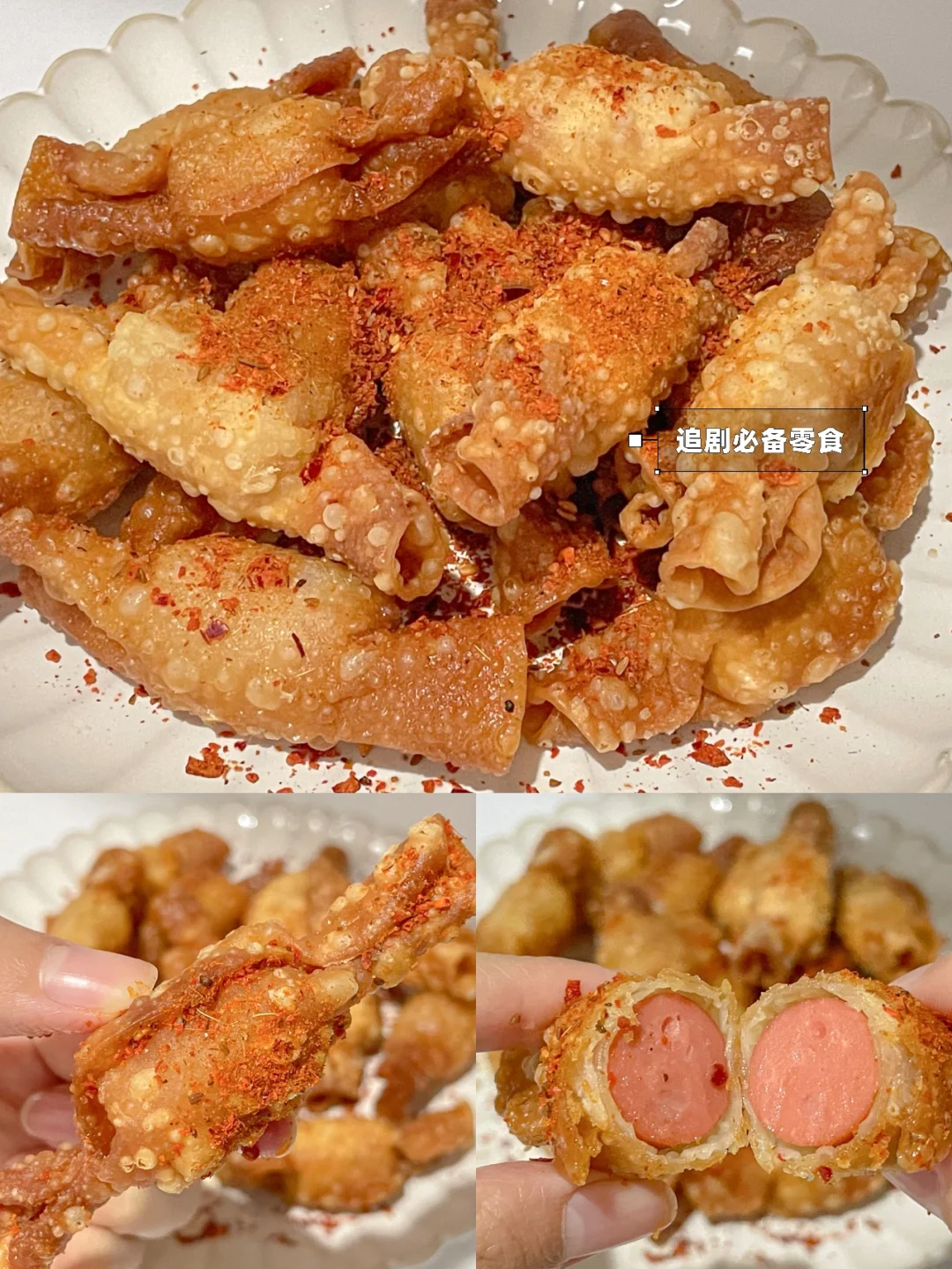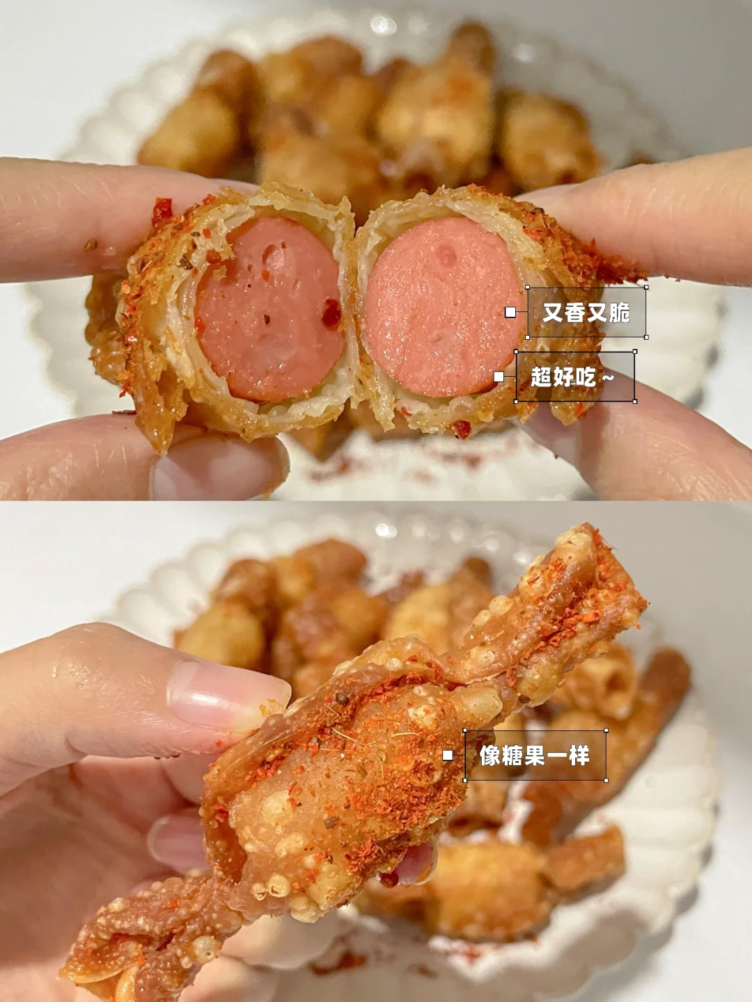 [萌萌哒R]用饺子皮做的小零食,香香脆脆,大人小孩都抢着吃~[哇R] [吧唧R]只要两种食材,做法超简单,喜欢的赶紧试试哦~ 🌈准备食材: 饺子皮、火腿肠 🌈做法步骤: 1⃣️把火腿切成小段。 2⃣️用饺子皮把火腿包起来,先合一半,在封口处沾水,把另外一半合起来。 3⃣️把两头拧起来,拧紧,如果不沾也可适当沾点水,拧好就像糖果一样。 4⃣️六成油温下锅炸,炸至金黄酥脆即可捞出。撒上烧烤料更香哦。[赞R]