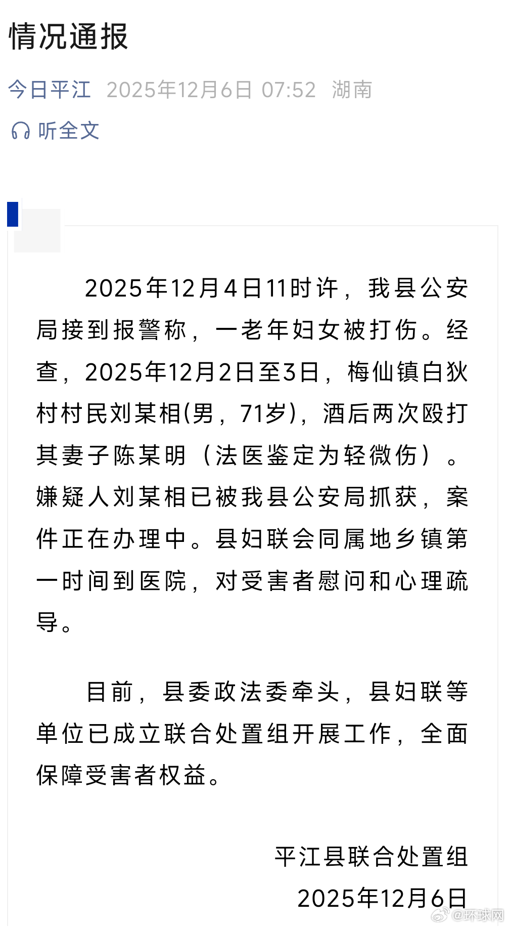 #湖南通报男子酒后两次殴打妻子#【男子酒后两次殴打妻子,湖南平江通报:嫌疑人已被抓获,案件正在办理中】 2025年12月4日11时许,我县公安局接到报警称,一老年妇女被打伤。经查,2025年12月2日至3日,梅仙镇白狄村村民刘某相(男,71岁),酒后两次殴打其妻子陈某明(法医鉴定为轻微伤)。嫌疑人刘某相已被我县公安局抓获,案件正在办理中。县妇联会同属地乡镇第一时间到医院,对受害者慰问和心理疏导。目前,县委政法委牵头,县妇联等单位已成立联合处置组开展工作,全面保障受害者权益。(平江县联合处置组)