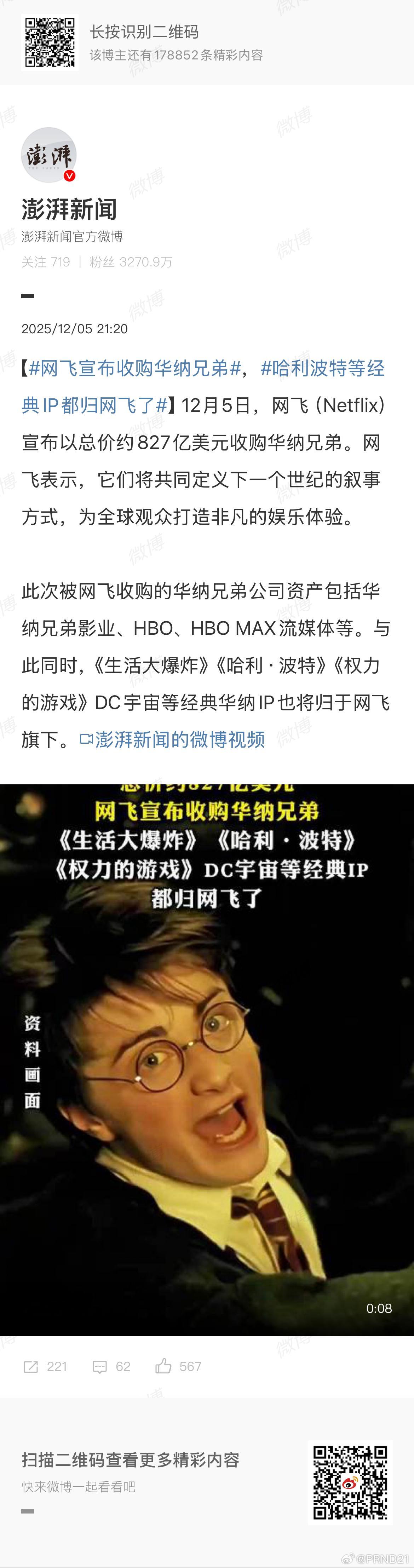哈利波特等经典IP都归网飞了 看题目还以为只是HP的事儿,再看好家伙网飞直接把华纳收了啊……看来赚得的确多……能不能整点儿反英雄的哈利波特衍生,想看碎嘴子的斯莱特林坏学生拯救霍格沃茨……