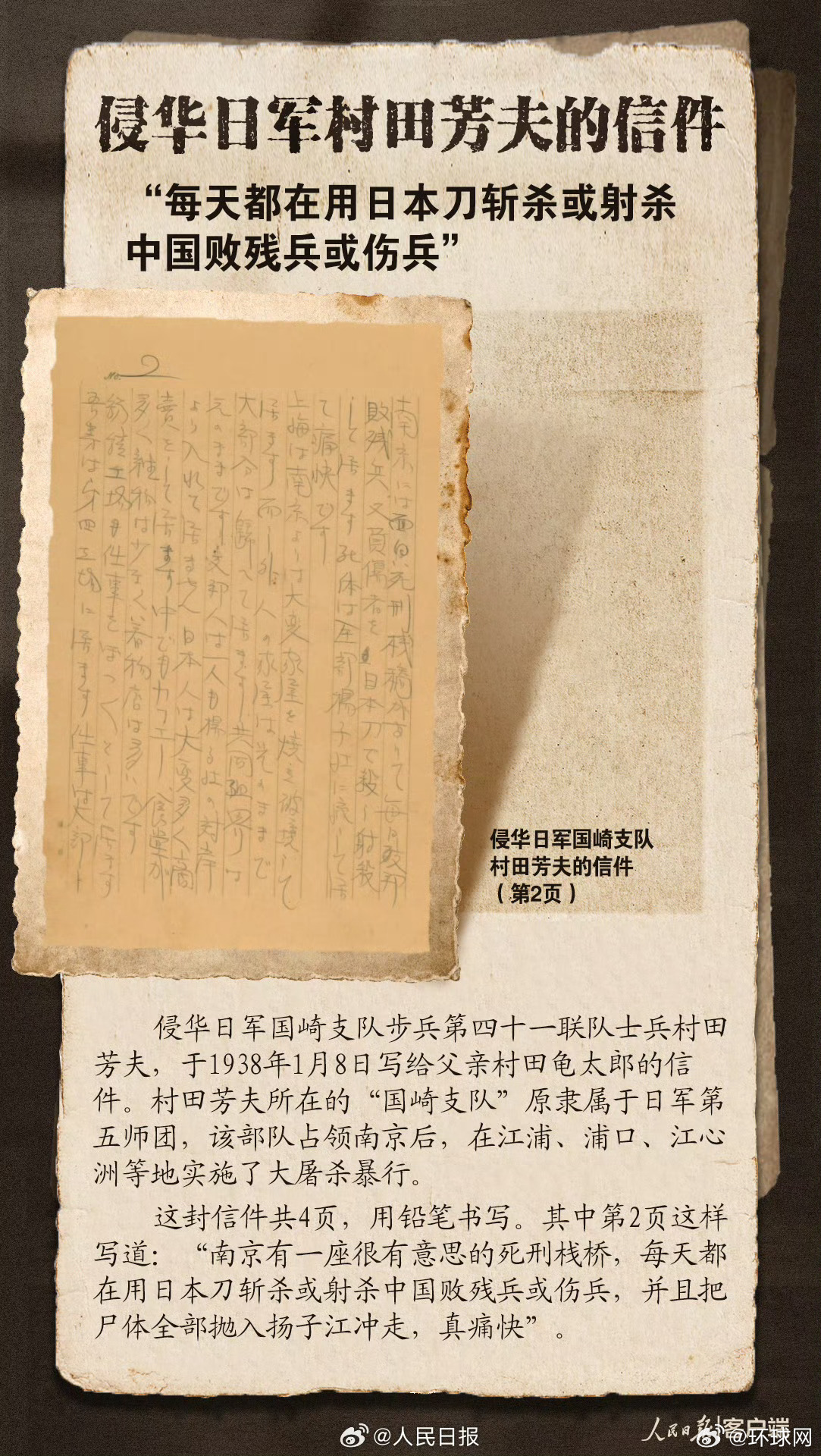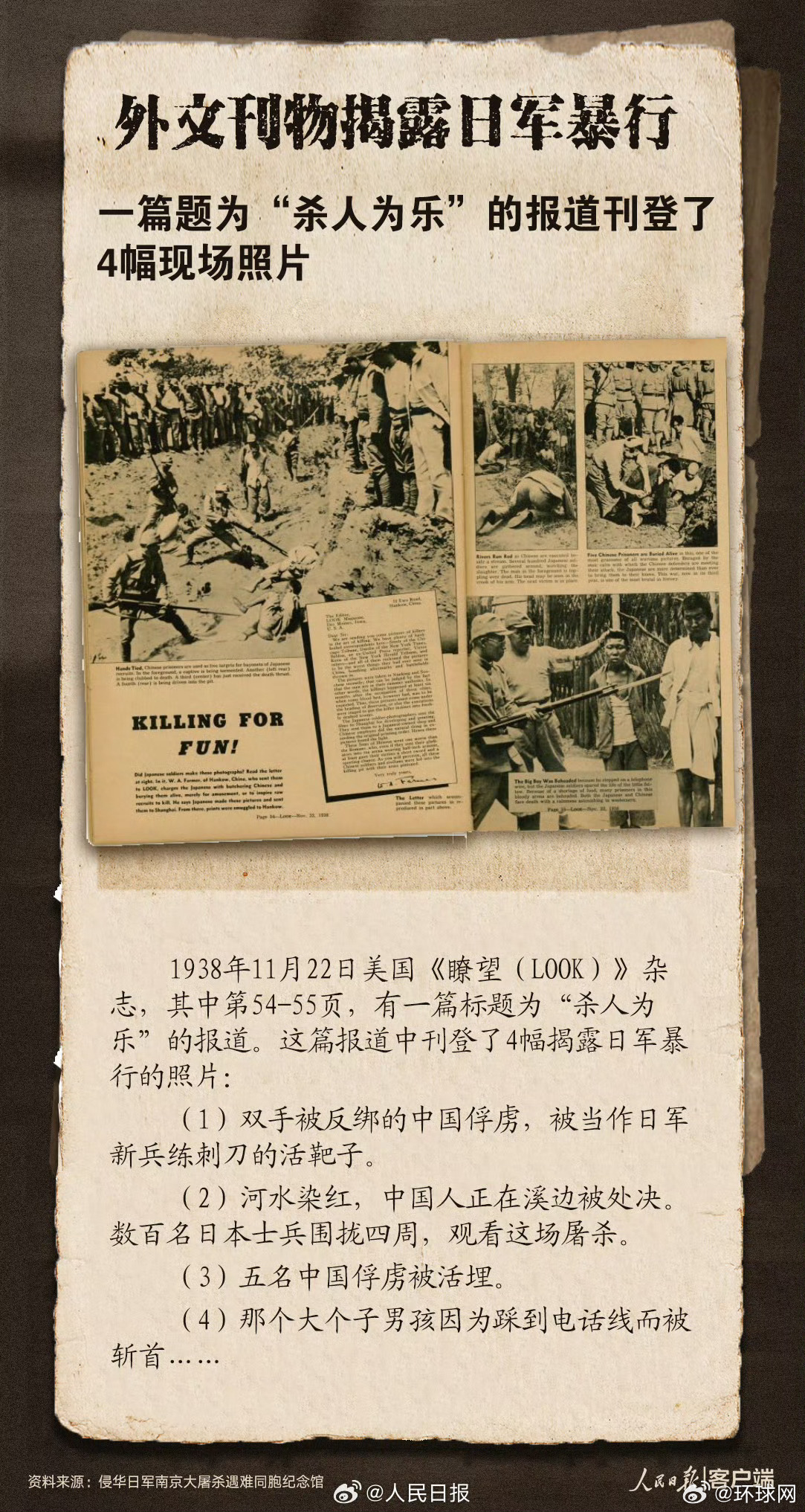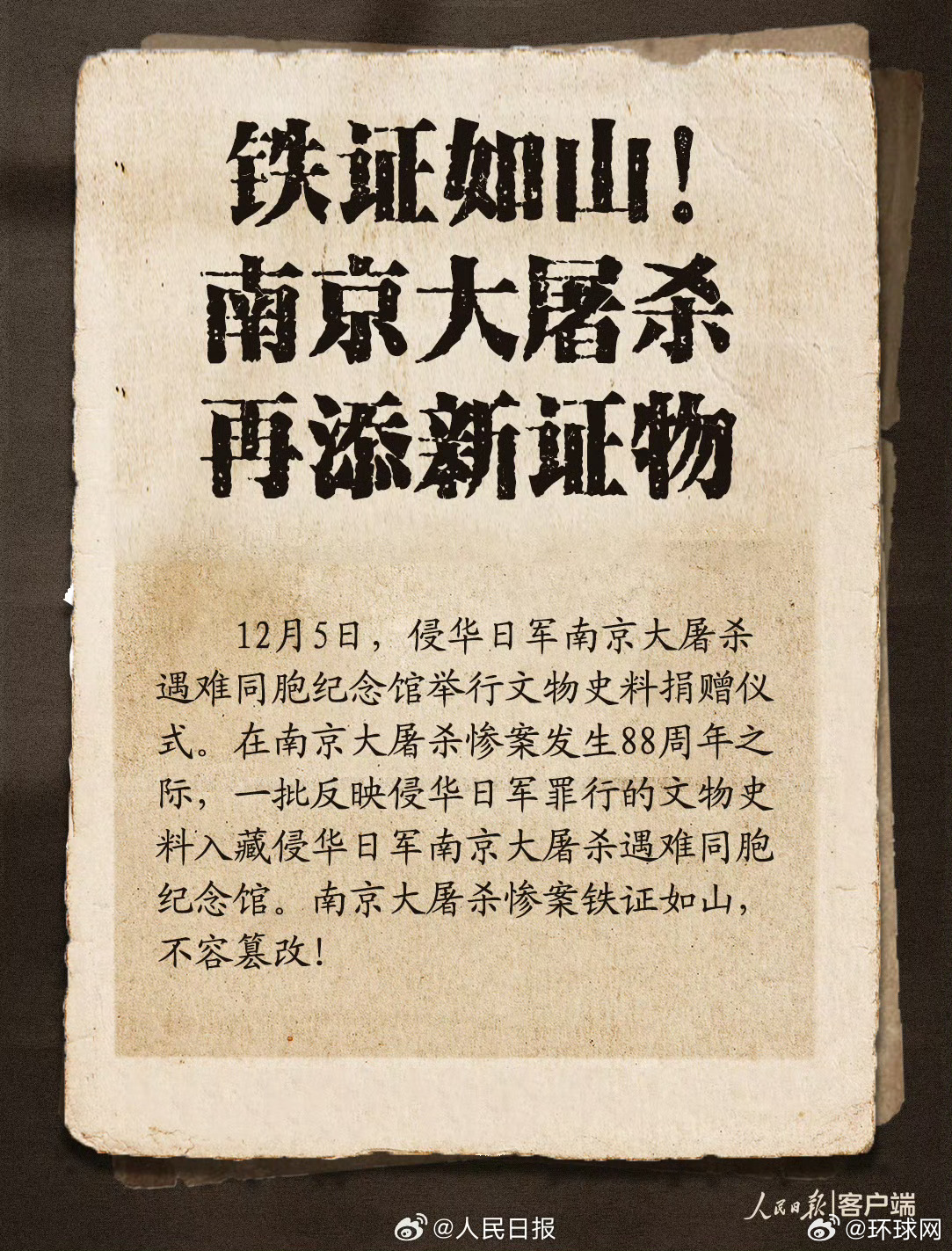 【铁证如山!#南京大屠杀惨案再添新证物#】#历史照片记录日军占领南京前后情景# “每天都在用日本刀斩杀或射杀中国败残兵或伤兵”“日军用汽油烧毙华人、用枪尖刺死妇孺、并强奸妇女”……12月5日,侵华日军南京大屠杀遇难同胞纪念馆举行文物史料捐赠仪式。在南京大屠杀惨案发生88周年之际,一批反映侵华日军罪行的文物史料入藏侵华日军南京大屠杀遇难同胞纪念馆。南京大屠杀惨案铁证如山,不容篡改!网页链接(人民日报)