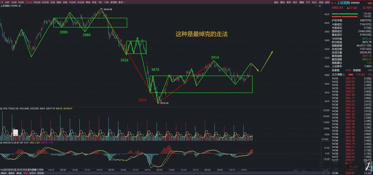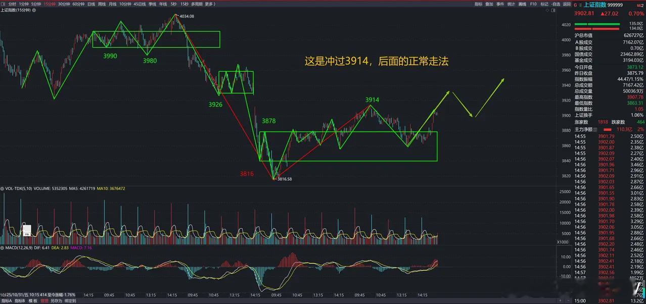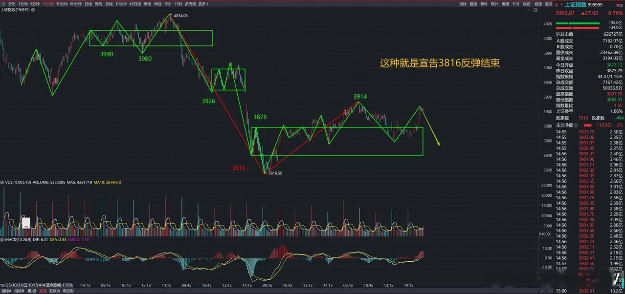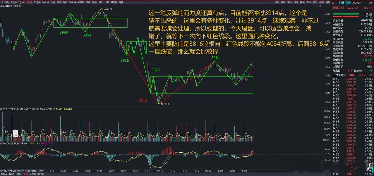 大盘结构:反弹遇阻关键位,减仓防御为上昨日15分钟级别反弹如期展开,但当前仍受制于前期高点3914点压制。若能强势突破该阻力位,可继续跟踪后续动能;若久攻不破,稳健型投资者需果断执行减仓操作,当前核心策略仍以短线博弈为主——即便出现“抛错”情形,后续可等待下方红色线段内部绿色笔形成1买或2买结构时,再择机低吸布局。无论3914点能否突破,核心防御逻辑不变:若3816点启动的反弹未能突破4034点前期高点,后续大概率会再次回踩3816点支撑位;一旦该支撑失守,意味着3040点以来的中线反弹行情将正式宣告终结。后市演化存在多重可能性,已梳理相应走势推演路径,后续可对照实际盘面对号入座。股市波动虽千变万化,但只要读懂结构逻辑,就能提前制定适配策略;也可结合自身判断预判潜在走势,预设符合个人操作风格的应对预案。我的每日解盘如同医生阅片般,基于盘面结构给出客观、理性的分析与操作参考,不掺杂主观情绪导向。