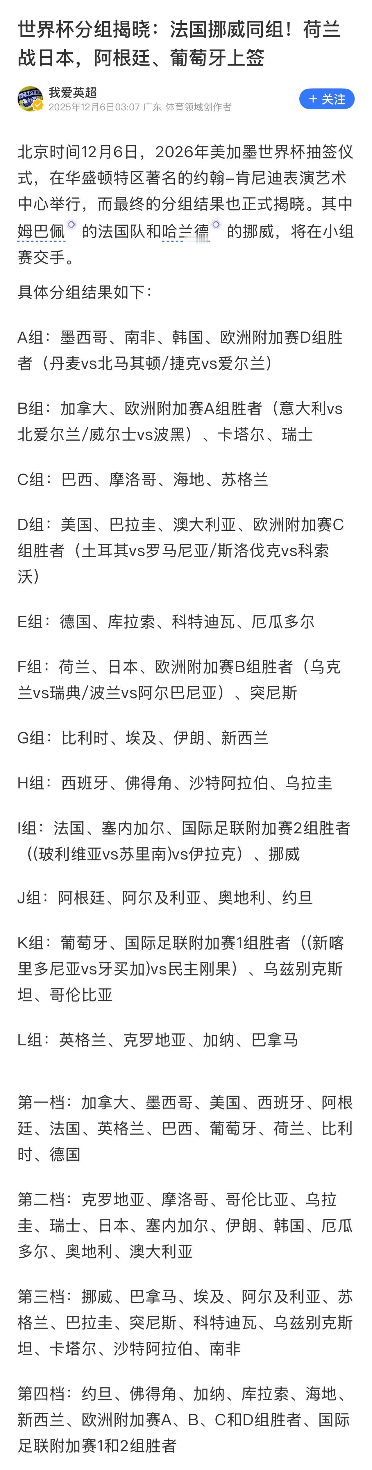 综合分析: 本次抽签,阿根廷与葡萄牙确实抽得了上签,成功避开了多数传统强队。而法国与挪威的同组则颇具看点,让姆巴佩与哈兰德的巨星对决提前上演。 然而,传统强队的签运并非全部乐观。卫冕冠军阿根廷所在的半区潜在挑战不少,而英格兰等队若想走得更远,从小组赛开始便需严阵以待。巴西队作为另一大热门,其所在小组虽无同等量级的对手,但可能遭遇的“黑马”球队的冲击亦不可不防。 亚洲日本队签运亦佳,同组既无南美劲旅,也避开了夺冠热门;而韩国队形势不容乐观,一是有占天时地利人和的东道主墨西哥队,二是若丹麦或爱尔兰出线,无论是面对技术流的丹麦还是作风硬朗的爱尔兰,都将对韩国队的出线前景构成实质威胁。 总体来看,本届赛事并未形成公认的、多支顶级强队扎堆的“超级死亡之组”。除法国对阵挪威、荷兰所在的小组因实力接近而稍显艰难外,其余如阿根廷、西班牙等传统劲旅的出线形势确实相对明朗。