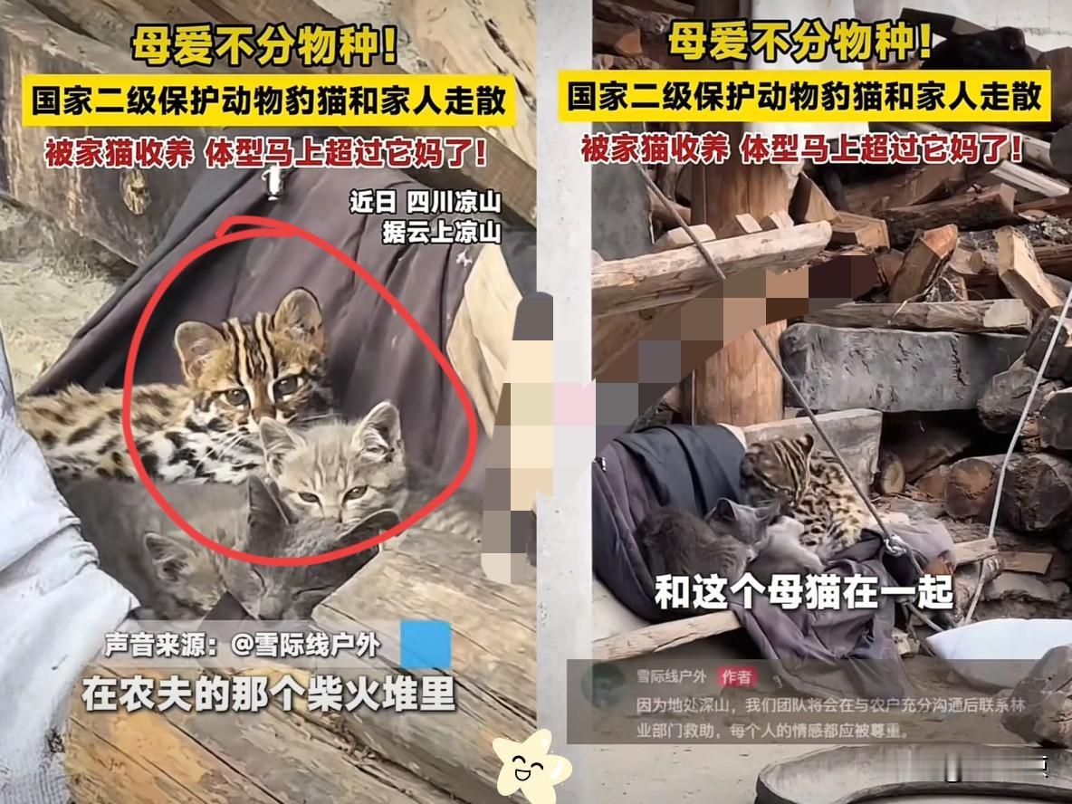 太有灵性了!四川一男子爬山途中,竟然在农户柴火堆里,发现震撼一幕,家猫妈妈正低头喂奶,可混在中间的居然是只带铜钱斑的豹猫崽,把家猫当成亲妈,蹭来蹭去撒娇超黏人~ 这只国家二级保护动物大概率是跟豹妈妈走散了,被心软的家猫捡回家当亲娃养! 猫妈哪懂什么物种区别,眼里只有“要护着的小可怜”,舔毛、喂奶、搂怀里保暖样样不落下,豹猫崽也不见外,抢奶、蹭下巴的样子跟家猫崽没差! 最戳人的就是这份纯粹的善意,动物的母爱从不管“非我族类”,只凭本能守护弱小! 但感动归感动,遇到野生保护动物可不能私自留,及时联系林业站,才能让它们保住野外生存的本事! 万物有灵,跨越物种的温暖最是治愈!