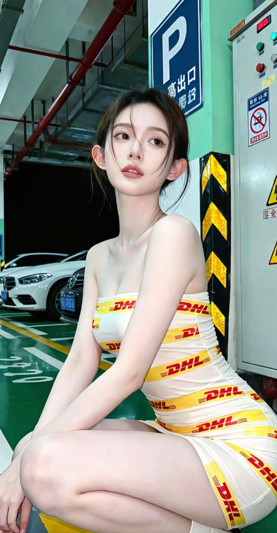 DHL黄条纹裹着软的腰线,像快递箱里意外拆出的春日。她蜷在黄绿标线间,发丝蹭过应急灯的冷光,唇色是机械背景里唯一的暖调。 金属管道的阴影落下来,却遮不住眼尾那点漫不经心——像把鲜活的甜,随手丢进工业风的容器里。车灯光扫过的瞬间,连“禁止停留”的标识,都成了这场反差感里的注脚。