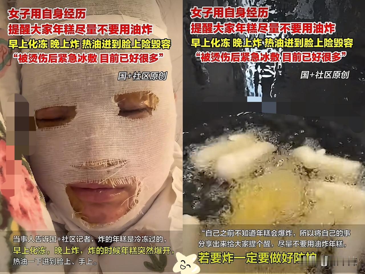 悲剧还是发生了!安徽阜阳,一女子嘴馋想吃炸年糕,从冰箱拿出来化冻一天就下锅,结果年糕“砰”的一声直接爆开,滚烫的热油瞬间溅到脸上和手上,现在还在医院接受治疗! 千万别觉得化冻透了就安全!年糕里藏着的水分和密闭空气,遇高温会快速汽化膨胀,没处释放可不就成了“隐形炸弹”? 冻货直接油炸的风险大家都知道,没想到化冻后的年糕也这么坑! 好在她反应够快,立马用凉水冲洗+冰块冷敷,没造成大面积水泡,但容貌会不会受影响,医生也没法打包票! 其实在家油炸超简单,提前用牙签扎几个孔排气,把表面水分彻底控干,再用小火慢炸,就能避开这些坑! 好吃从来不是冒险的理由,做饭安全才是第一位!