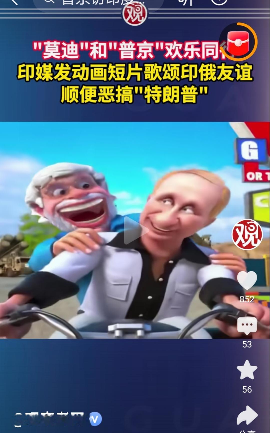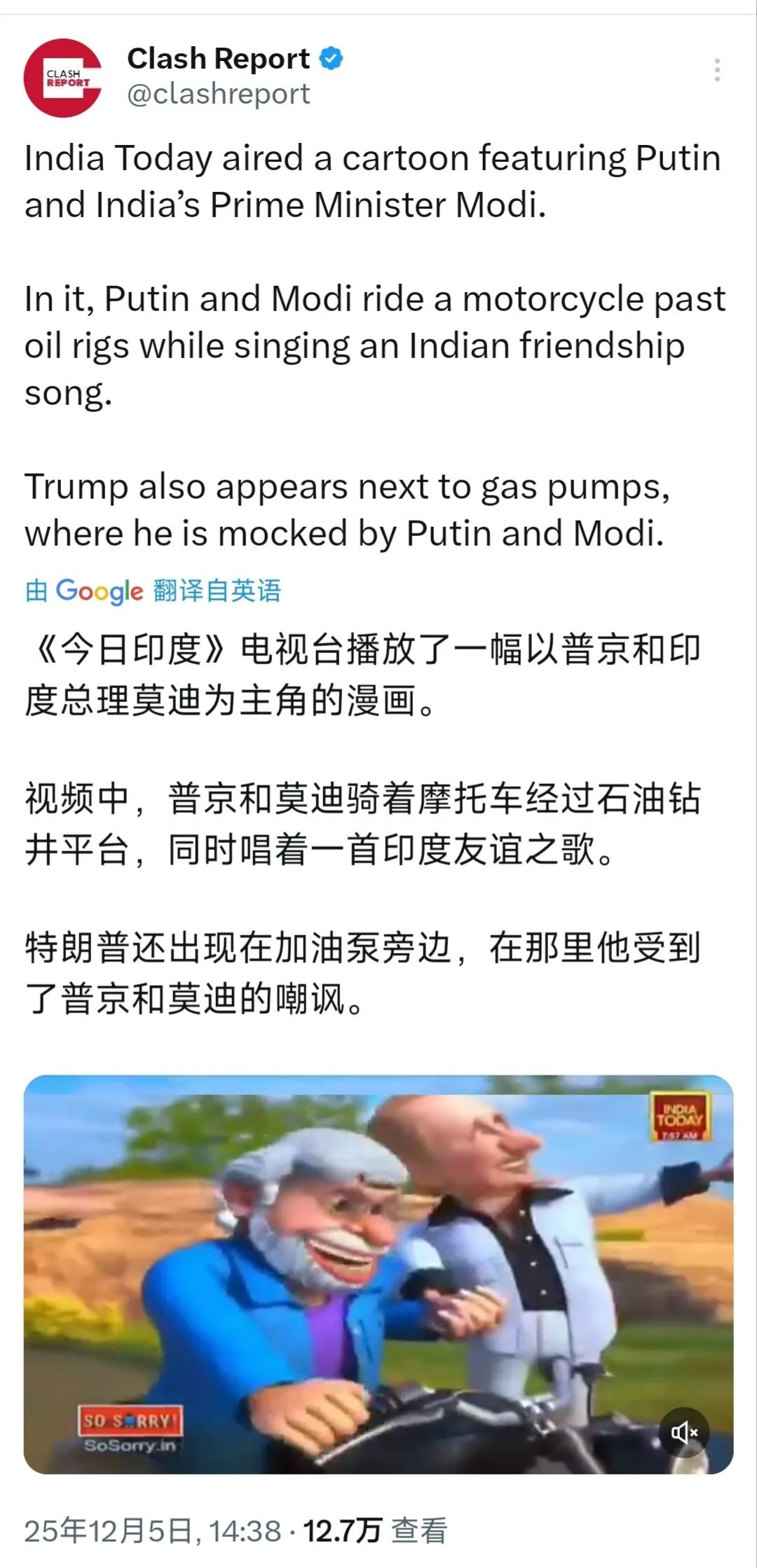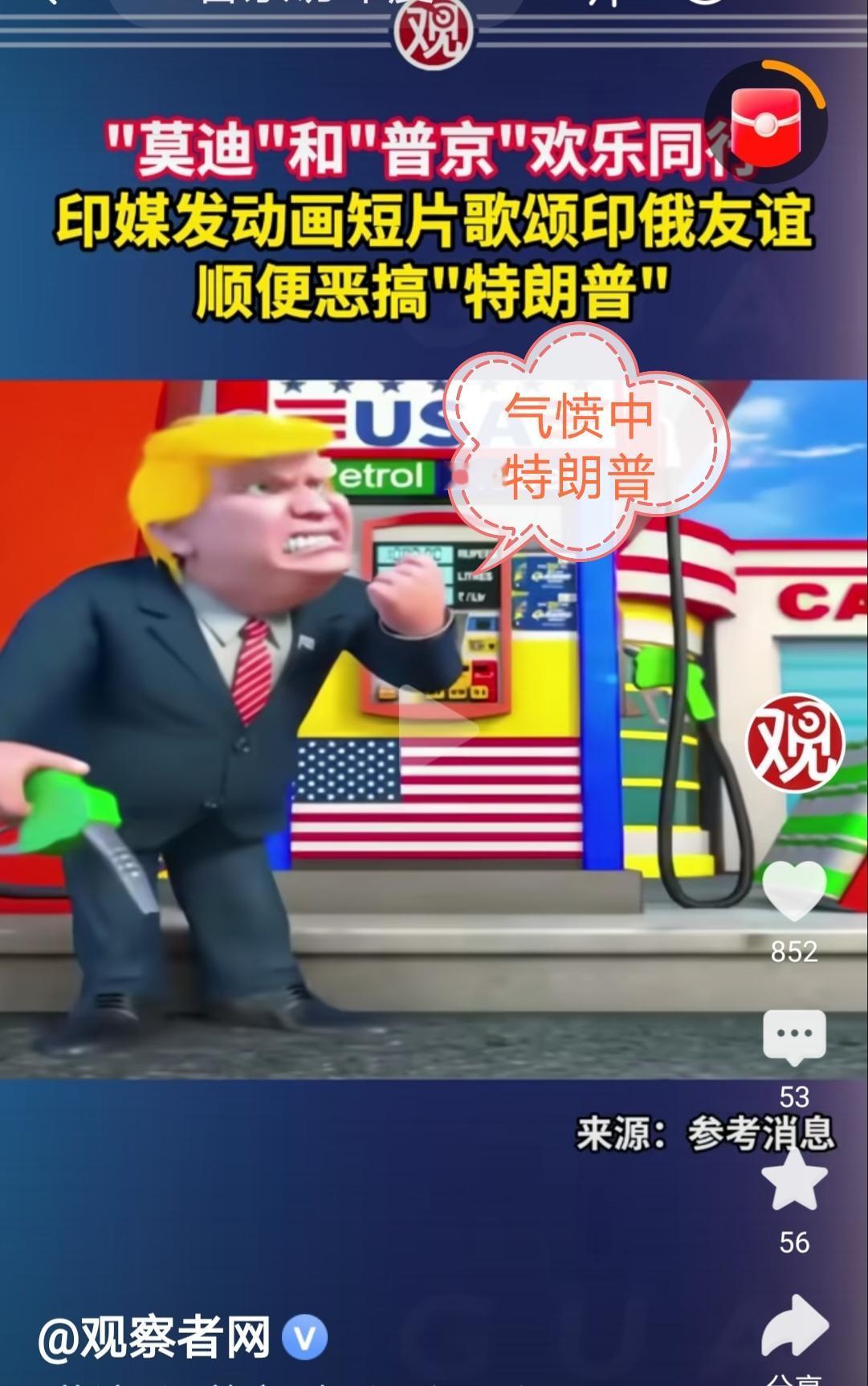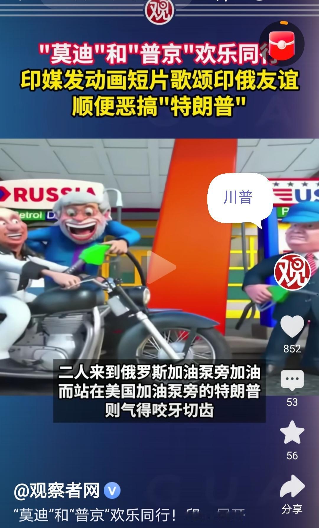 12月5日《今日印度》电视台播放了一幅以普京和印度总理莫迪为主角的漫画。视频中,普京和莫迪骑着摩托车经过石油钻井平台,同时唱着一首印度友谊之歌。特朗普还出现在加油泵旁边,在那里他受到了普京和莫迪的嘲讽。 印度发出动画短片歌颂印俄友谊顺便恶搞“特朗普”,这说明印度并不在乎美国的警告及“二级制裁”,继续购买俄罗斯石油,也说明印媒想表现出印俄之间的友谊并不会受到俄乌冲突的任何影响。就不知道特朗普看这些有何感想,又会做出什么反应呢?