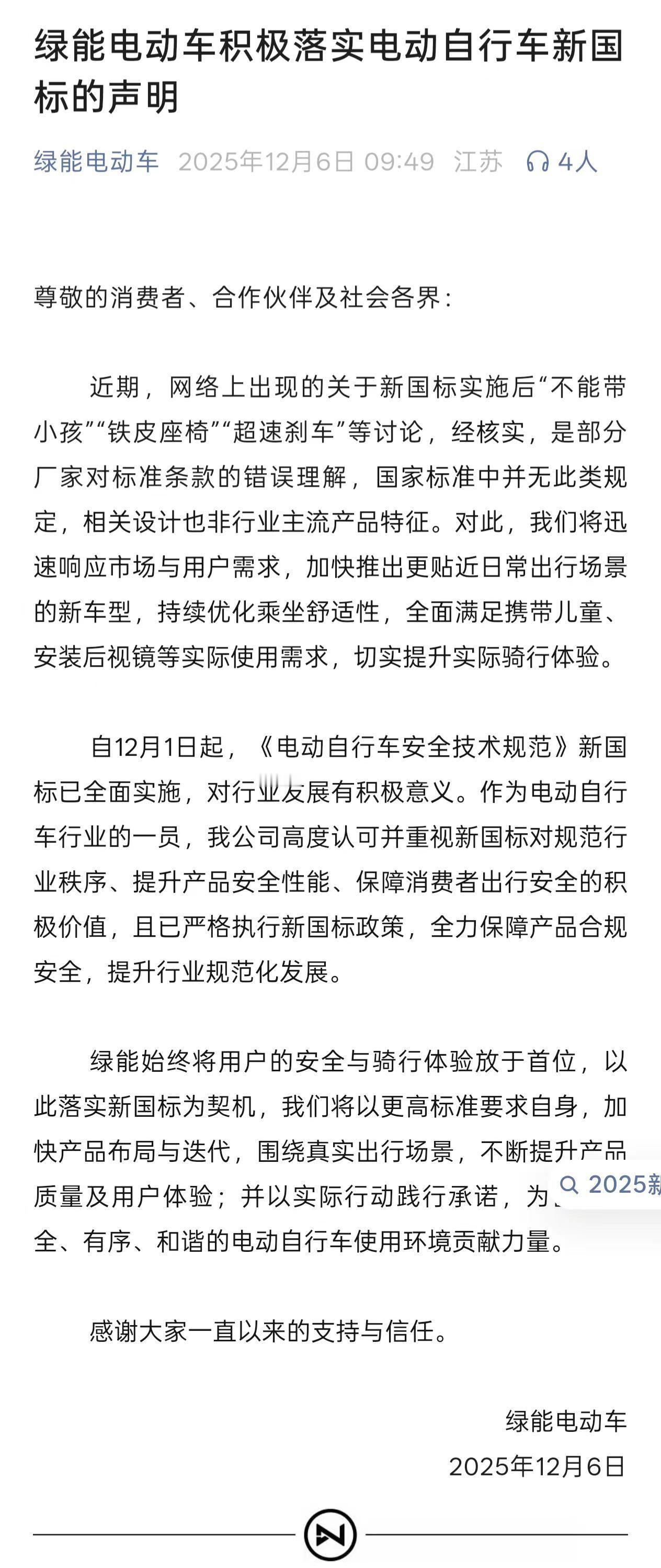 不能带小孩系新国标误读绿能电动车今日发布声明称,近期网络上出现的关于新国标实施后“不能带小孩”“铁皮座椅”“超速刹车”等讨论,经核实,是部分厂家对标准条款的错误理解,国家标准中并无此类规定,相关设计也非行业主流产品特征。据悉,除绿能外,小牛电动、台牛、台铃、踏浪、雅迪、绿源、倍特、爱玛、立马、比德文、富士达、小刀电动车、绿驹、九号公司、五羊-本田公司等多家企业纷纷发文表达了类似观点,并表示将坚决执行电动自行车新国标。超速刹车系电动车新国标误读
