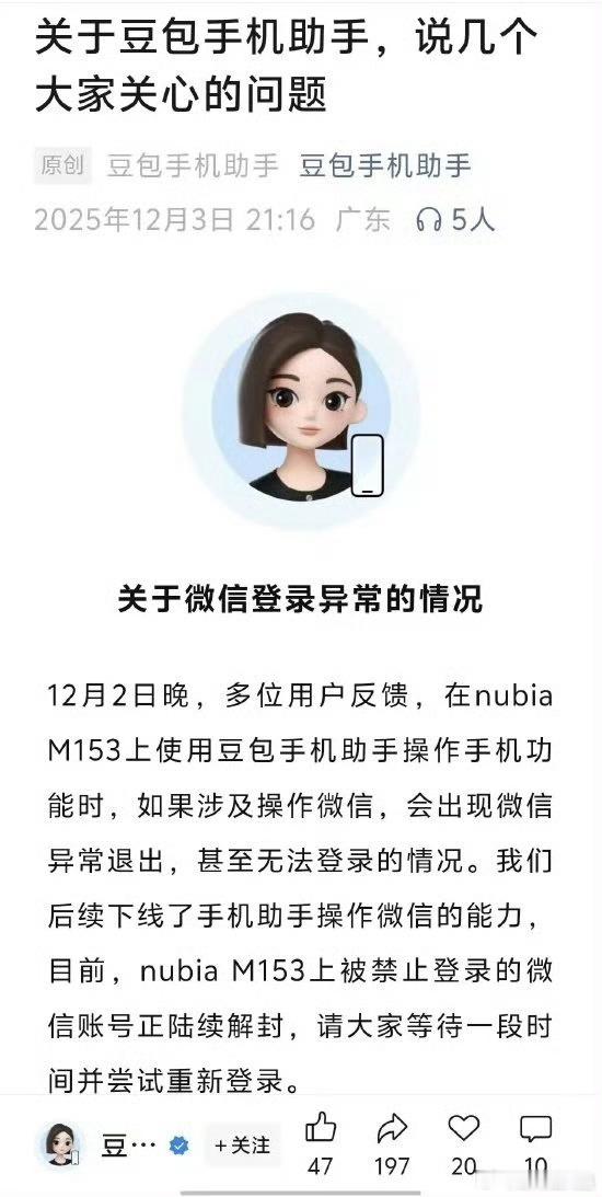 豆包手机 微信豆包手机已经被微信制裁,无法再控制操作微信,甚至微信号都被封了,这么玩下去的话,豆包手机真要如罗巍老师说的一代而亡了。。
