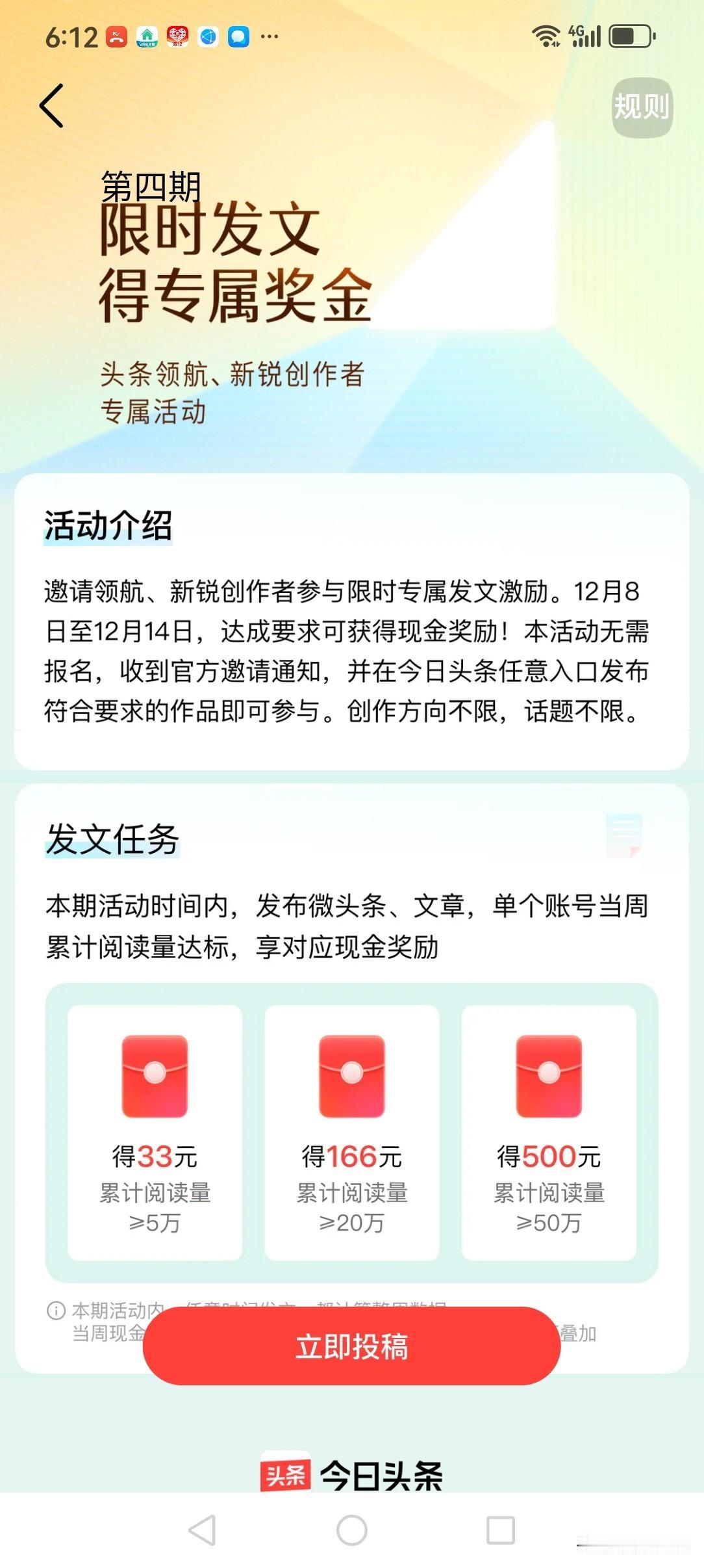 老伙计们,好消息头条又开始有新活动了,这次的奖励挺大呀,最高奖励500元。 从12月8号至12月14日单个账号发微头条,文章,达到阅读量要求即得现金 单周最多可得500元。 本次活动只要作者在一周内发表微头条,文章,单个账号累计阅读量达标,享对有现金奖励。 一等奖。500元,累计阅读量达50万。 二等奖。166元,累计阅读量达20万。 三等奖。33元,累计阅读量5万。 老伙计们努力加油吧,争取拿到奖金。