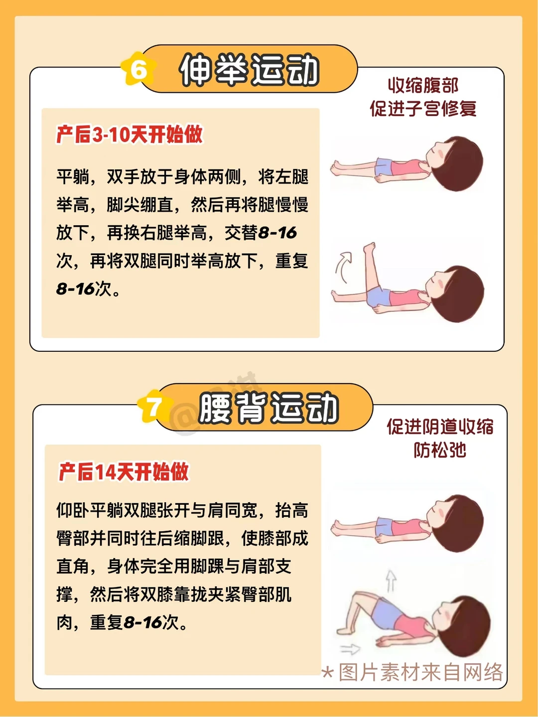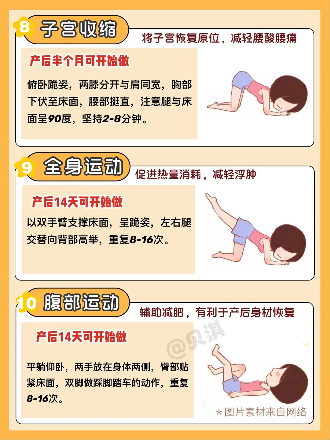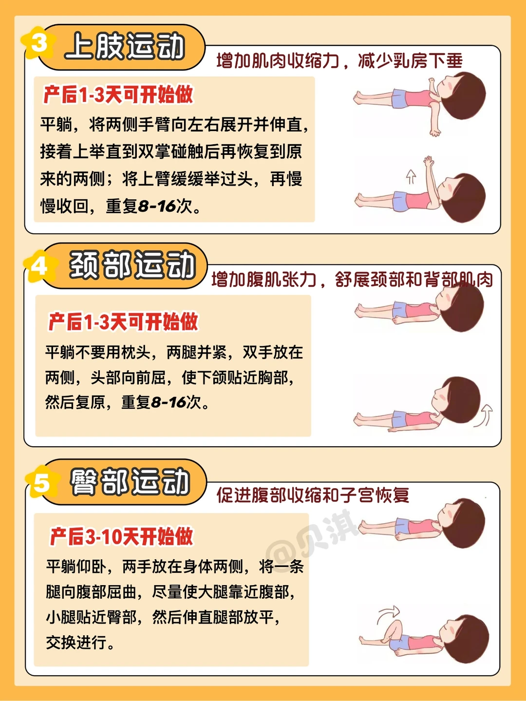 - 剖腹产/有侧切:产后10天开始,先从上半身开始活动,运动量慢慢增加