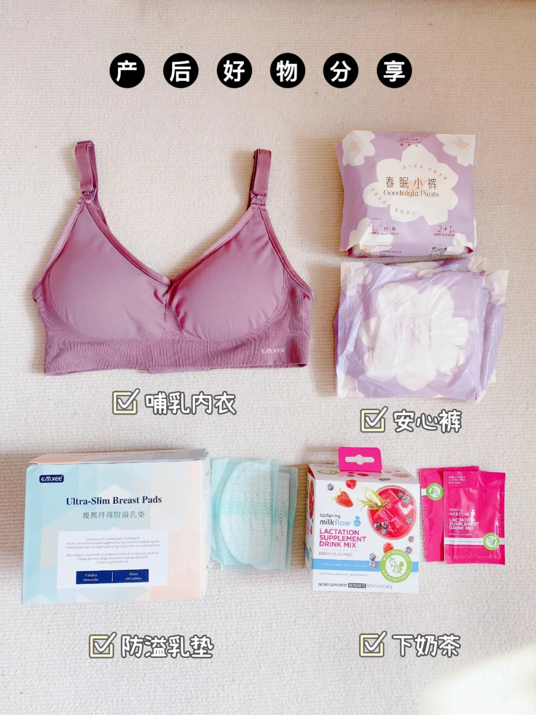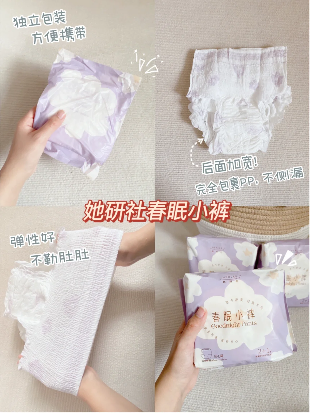 生产后1-4天会出现红色恶露,血流量较大,甚至伴有血块,侧躺喂奶时很容易出现大量侧漏,夜用的加长姨妈巾也不够用。我产后很爱用她研社的春眠小裤,背面有加宽可以360度全包裹pp,恶露量大也不担心侧漏~ 这个安心裤也很服帖,侧身喂奶的时候不会位移,很舒服