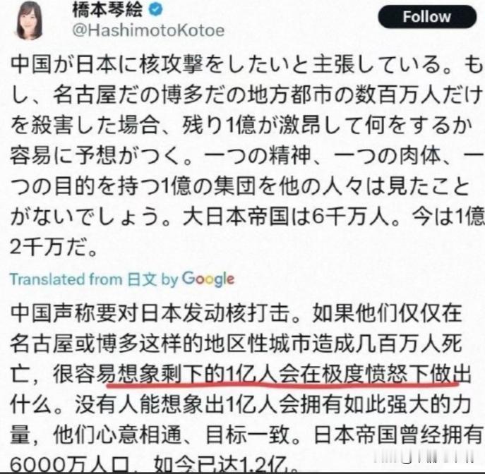 日本右翼叫嚣“不怕中国核弹”:死几百万人没关系,剩下1亿人会报仇 当地时间12月3日,日本女作家桥本琴绘公然在社媒宣称,中国说要对日本发动核打击,但如果“仅仅”在名古屋之类的地区性城市造成几百万人死亡,那剩下的1亿日本人会在极度愤怒下团结起来,向中国报仇。 说白了这日本右翼就是揣着明白装糊涂,拿几百万人的性命当嘴炮筹码,忘了自己当年挨核弹当跟班的怂样,更忘了欠中国人民的血债还没还! 这话听着简直离谱到没边,先不说中国压根就没说过要对日本动核,就算退一万步讲,真有那一天,他们所谓的 “一亿人报仇” 不过是自欺欺人的笑话。 当年美国在广岛、长崎投下两枚核弹,直接造成数十万日本人伤亡,那会儿日本剩下的人口可比现在所谓的 “1 亿人” 还多,结果呢? 不仅没见他们报仇,反而转头就成了美国的忠实跟班,这么多年来跟着美国的步伐跑东跑西,连自己的国防都要靠别人罩着,这就是他们嘴里的 “报仇”?说出来真是让人笑掉大牙。 反观我们中国,当年在抗日战争中付出了三千五百万同胞的惨痛代价,无数家庭支离破碎,山河破碎的伤痛至今还刻在民族记忆里,真正该谈报仇的,从来都是我们! 可我们始终选择铭记历史而非延续仇恨,一心搞发展谋和平,这格局和境界,某些日本右翼怕是永远也理解不了。 日本这国家也是有意思,明明自己土地狭小得可怜,37.8 万平方千米的国土里还尽是山地丘陵,可耕地少得可怜,矿产、能源这些关键资源几乎全靠进口,偏偏还老遇上地震、火山喷发这些天灾,生存环境可以说是相当恶劣。 而我们中国地大物博,960 万平方公里的土地上资源丰富,气候适宜,既能种出养活十几亿人的粮食,又有支撑工业发展的各类矿产,这些都是日本梦寐以求却得不到的。 眼看着中国这些年发展得越来越好,综合国力一路飙升,从曾经的积贫积弱到如今的世界强国,他们心里的嫉妒就像野草一样疯长,再加上骨子里那种岛国特有的生存焦虑,就转化成了对中国的无端仇恨,总想找点由头来刷存在感。 而且这位叫桥本琴绘的女作家,本身就是个极端右翼分子,之前还写过书美化二战侵略历史,否认南京大屠杀这样的铁事实,甚至还出过让成年女性露私处拉动经济这种奇葩主意,可见其言论有多不靠谱。 她嘴里说的 “一亿人团结报仇”,完全是脱离现实的幻想,有民调显示,现在只有 9% 的日本人愿意为国家参战,全球倒数第一,所谓的 “团结” 不过是右翼圈子里的自嗨。 况且日本现在老龄化、少子化严重,能源 99% 依赖进口,粮食自给率还不到 40%,真要是发生冲突,恐怕不用别人动手,自己的供应链先崩了。 更重要的是,中国早就明确承诺不首先使用核武器,也不对无核国家使用核武器,桥本琴绘故意编造 “中国要核打击日本” 的谎言,说白了就是为日本右翼推动扩军、突破和平宪法找借口。 他们这种拿生命当噱头的叫嚣,本质上还是延续了当年军国主义的老套路,靠制造外部威胁来煽动民族情绪。 可时代早就变了,现在的世界不是靠嘴炮就能称霸的,也不是靠煽动仇恨就能发展的,中国从来不会主动惹事,但也绝对不怕事,我们发展国防力量,包括核力量,目的只是为了自卫,为了不让历史悲剧重演。 以上仅为个人看法,不知道大家怎么看待日本右翼这种离谱言论?是觉得他们纯属哗众取宠,还是背后另有图谋?欢迎在评论区留下你的观点。