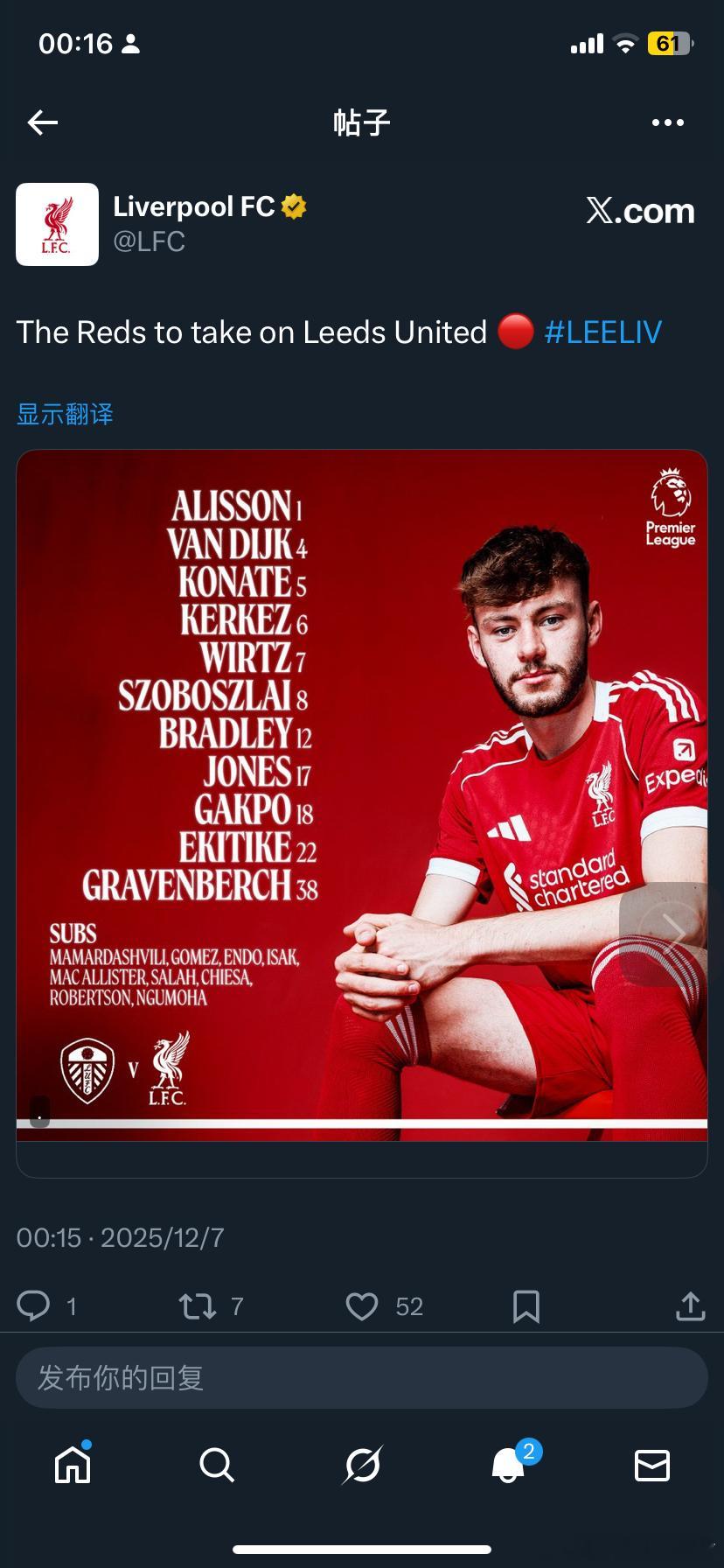 利物浦首发:阿利森布拉德利科纳特范迪克科尔克茨格拉索博琼斯维尔茨