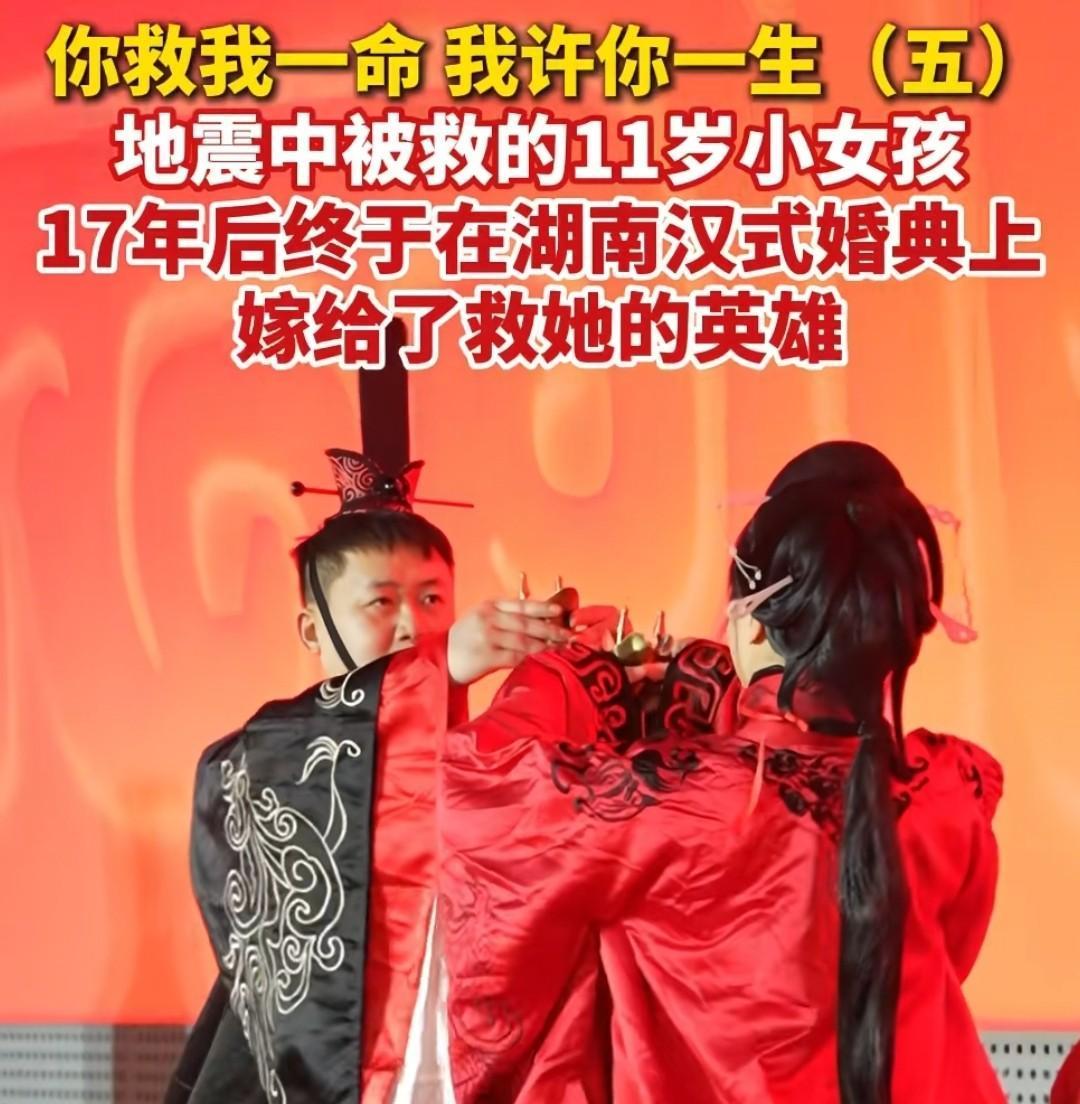 破防了! 汶川地震被救女孩, 17年后竟嫁给当年救她的军人! 汶川地震的神仙缘分太好哭!2008年8.0级地震里,10岁女孩刘喜美被埋青川废墟,战士梁智斌徒手扒瓦砾3小时,把她从绝境抱出来,她只记住那双沾泥却温暖的手。12年后两人在长沙餐馆偶遇,姑娘主动搭话认亲,慢慢生出情愫。虽有12岁年龄差,姑娘勇敢告白,两人互相包容磨合,还一起做传统文化电商。 2025年他们办了汉服婚礼,当年救命的手牵起新娘,续写浪漫。不是报恩是真心相爱,跨越17年的缘分,藏着最动人的温柔与坚守,看完满心暖意!