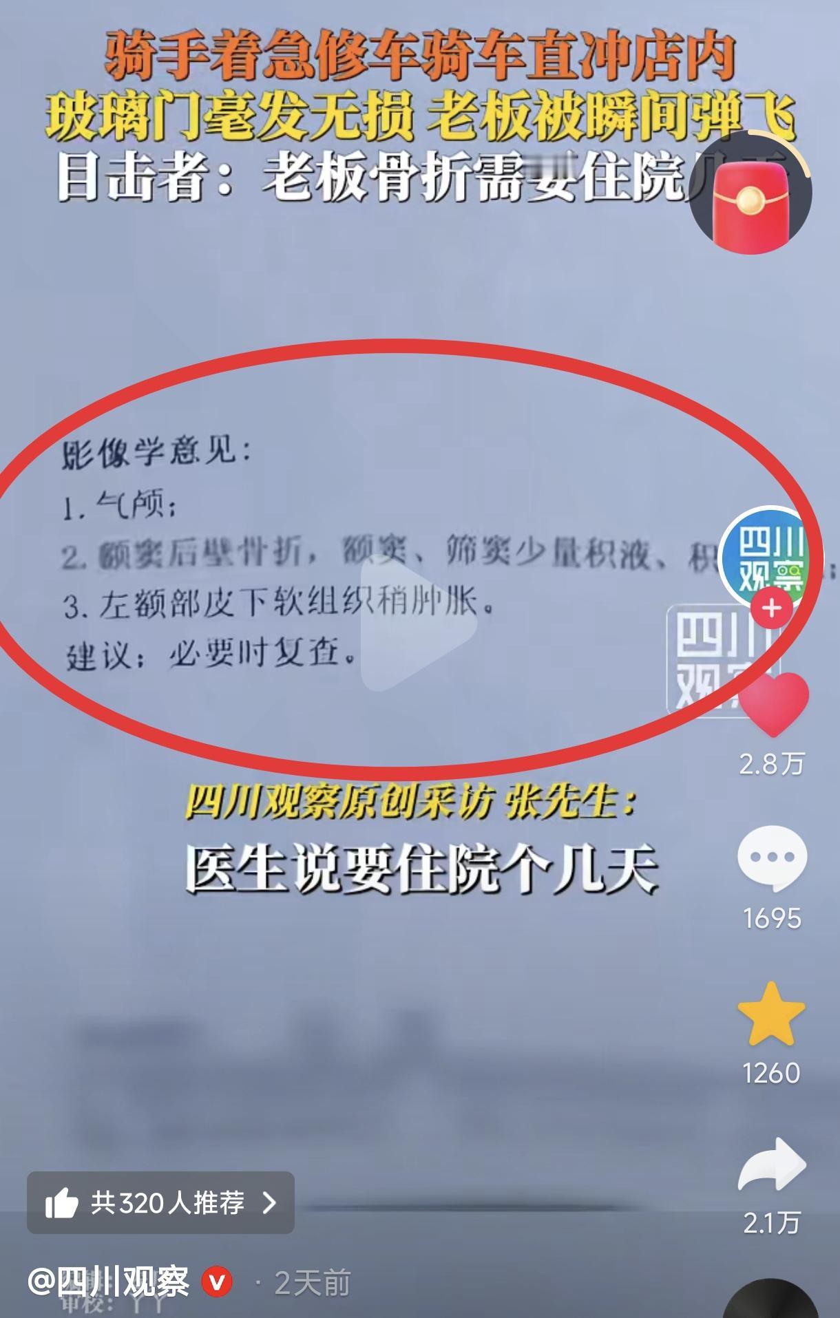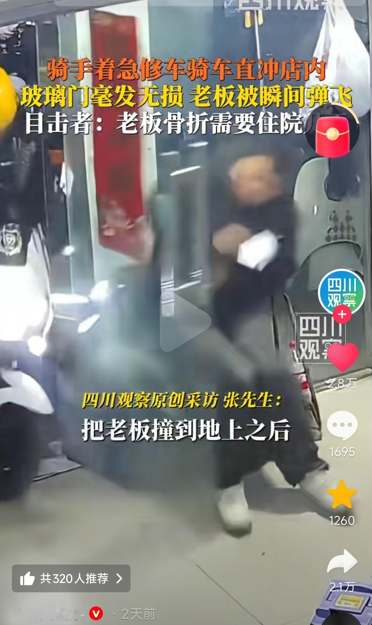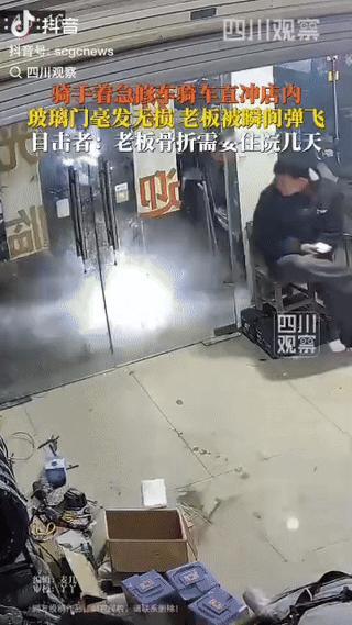 “人在家中坐,祸从天上来!”近日,河南南阳,骑手着急修车骑车冲进店里,没想到将坐在门口的老板瞬间撞飞,致老板牙齿当场撞碎一颗,头部骨折住院,而玻璃门却完好无损。网友:第一次看到修车先修理老板的。 (来源:四川观察) 不得不说,这位骑手太心急了,你都到人家店门口了,那你就停下来推车进店呗,也不差那几秒,就那么横冲直撞冲进人家店里,这下好了,修车修出来一大堆医疗等赔偿费来。 最冤的还是修车店老板,人家本来好好坐在店门口等生意上门的,没想到财神爷没等到,却等来了个阎王爷,将自己撞成骨折住进医院,常言伤筋动骨百日,伤的是还是头骨,真的是比窦娥还冤! 据店里的员工刘先生称,事发那天晚上,远处一道强光透进来,老板以为来客户了,扭头一看,好巧不巧的,刚好与进店的电瓶车“啪”的一声撞上了,老板当即被撞飞在地,牙齿撞碎了一颗...... 原来,这位骑手是把刹车当油门踩了~ 骑手吓坏了,赶紧与店里的几名员工将老板火速送医院治疗,通过拍CT,发现老板的头部气颅、额窦后壁稍骨折,额窦等积液......等等,这可是头部哦,不是小问题,动辄几千上万不等。 网友们对此,纷纷热议不止...... 有网友说,第一次看到修车先修理老板的,这下老板有心理阴影了,真是够倒霉了,今后再不敢坐门边了。 也有网友调侃说,看到老板被撞飞那一刻,原谅我不厚道的笑喷了,不要坐在门边,不要坐在门边,不要坐在门边,重要的事说三遍。(这些轻松的吐槽,也缓解了这场意外的沉重感) 还有网友说,确实很无语,这是骑车进门的“正常操作”,我家的门帘都快被踢穿了。还有的说,我们这一个宠物店老板给宠物洗澡时,被那只狗撞骨折了。 更有网友说,有的外卖骑手骑车快得吓人,跟他们坐一趟电梯都会有心理压力,因为有的电梯一停就骂,其实就算赶时间也要注意安全第一。 这件事既让人揪心又满是无奈,骑手着急修车心理可以理解,但错将油门当成刹车犯下低级错误将老板撞飞,不仅要承担老板的医疗等相关赔偿,还可能面临其他责任纠纷,这确实是得不偿失了。 这也给所有骑行者提了一个醒:无论有多紧急,操控车辆时都要保持冷静,避免发生意外风险! 对老板来说,这就纯属无妄之灾了,坐在自家门口休息却还能意外受伤住院,与玻璃门形成巨大反差,意外来得“猝不及防”,真是“祸从天降”。 这也让人意识到即便是人坐在室内或店门口,也要注意留意周边的突发状况,切记一定要将安全放在首位!