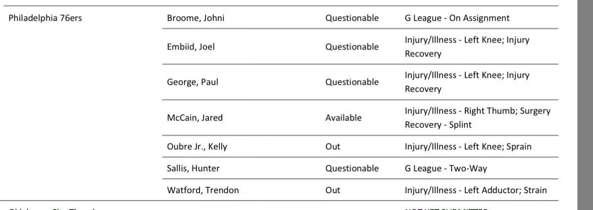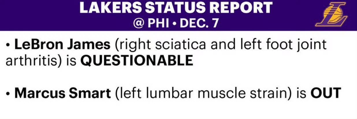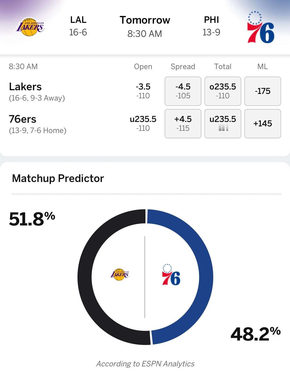 湖人明日8点30对阵76人,ESPN给出获胜概率:湖人51.8%、76人48.2%。东契奇回归,詹姆斯(右坐骨神经痛、左脚关节炎)出战成疑、马库斯-斯马特(左腰部肌肉拉伤)缺阵。布鲁姆(发展联盟)、恩比德(左膝盖)、乔治(左膝盖)、萨利斯(双向发展联盟)出战成疑;乌布雷(左膝)、沃特福德(左内收肌)缺席比赛。当前指数,76人主场+4.5。目测,险胜局。湖人vs76人