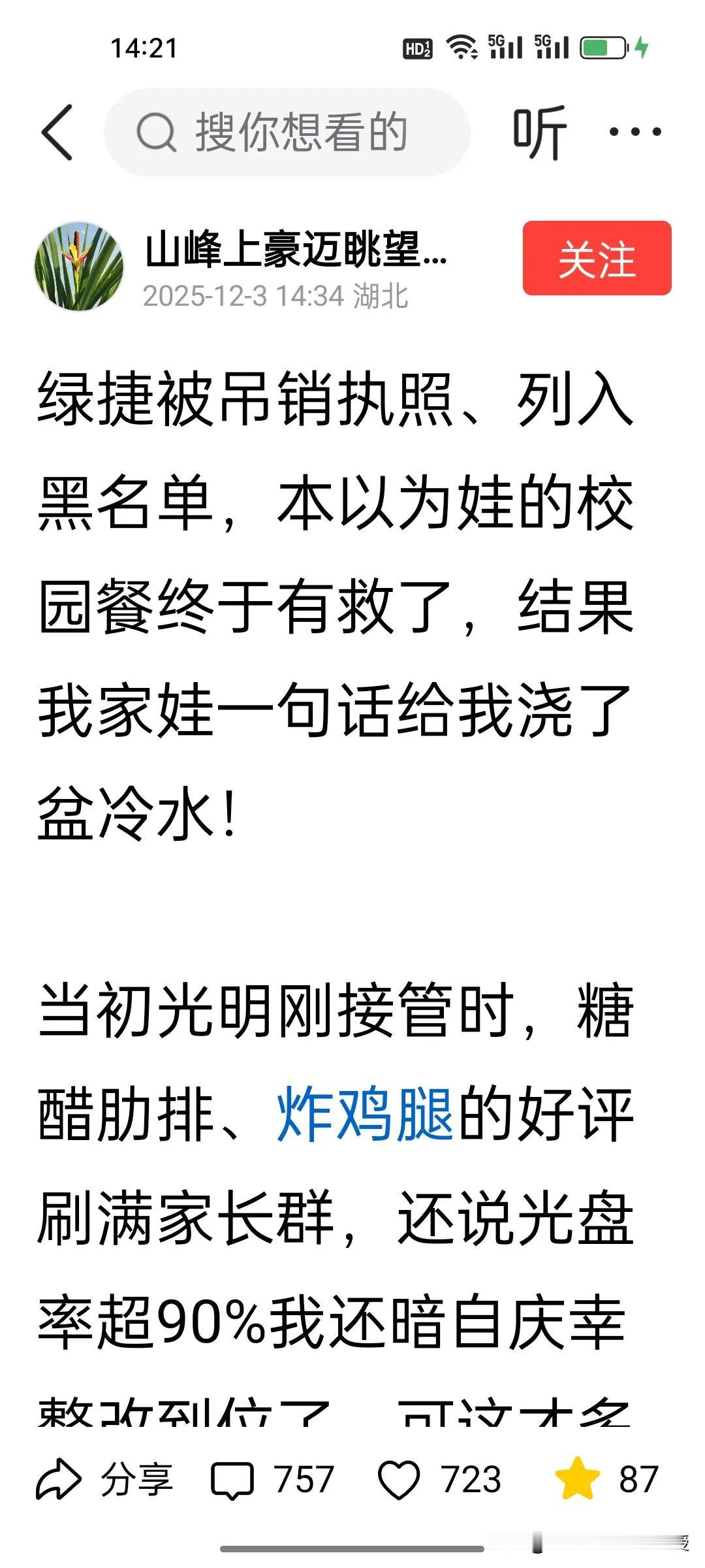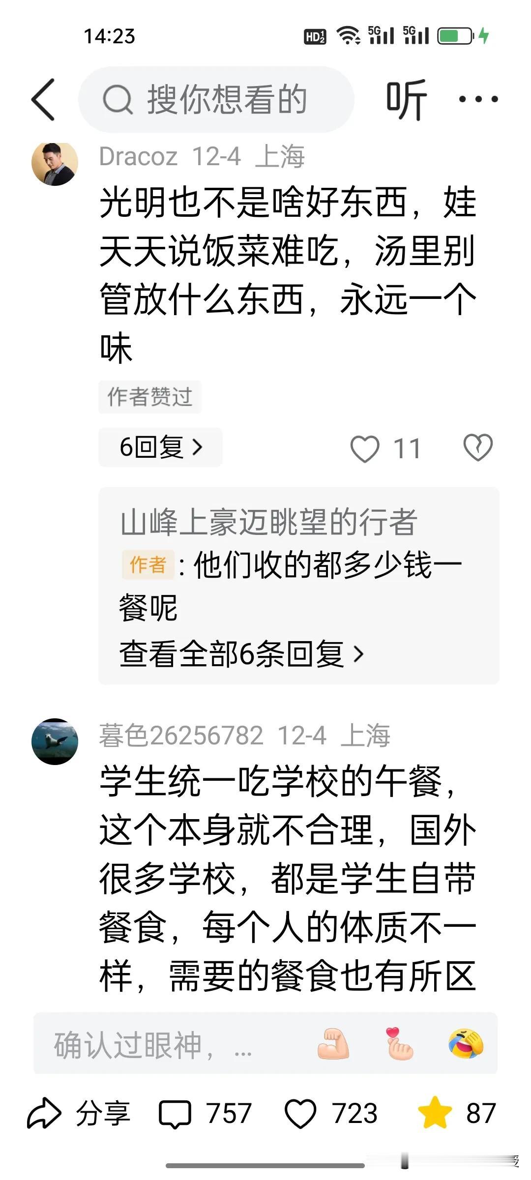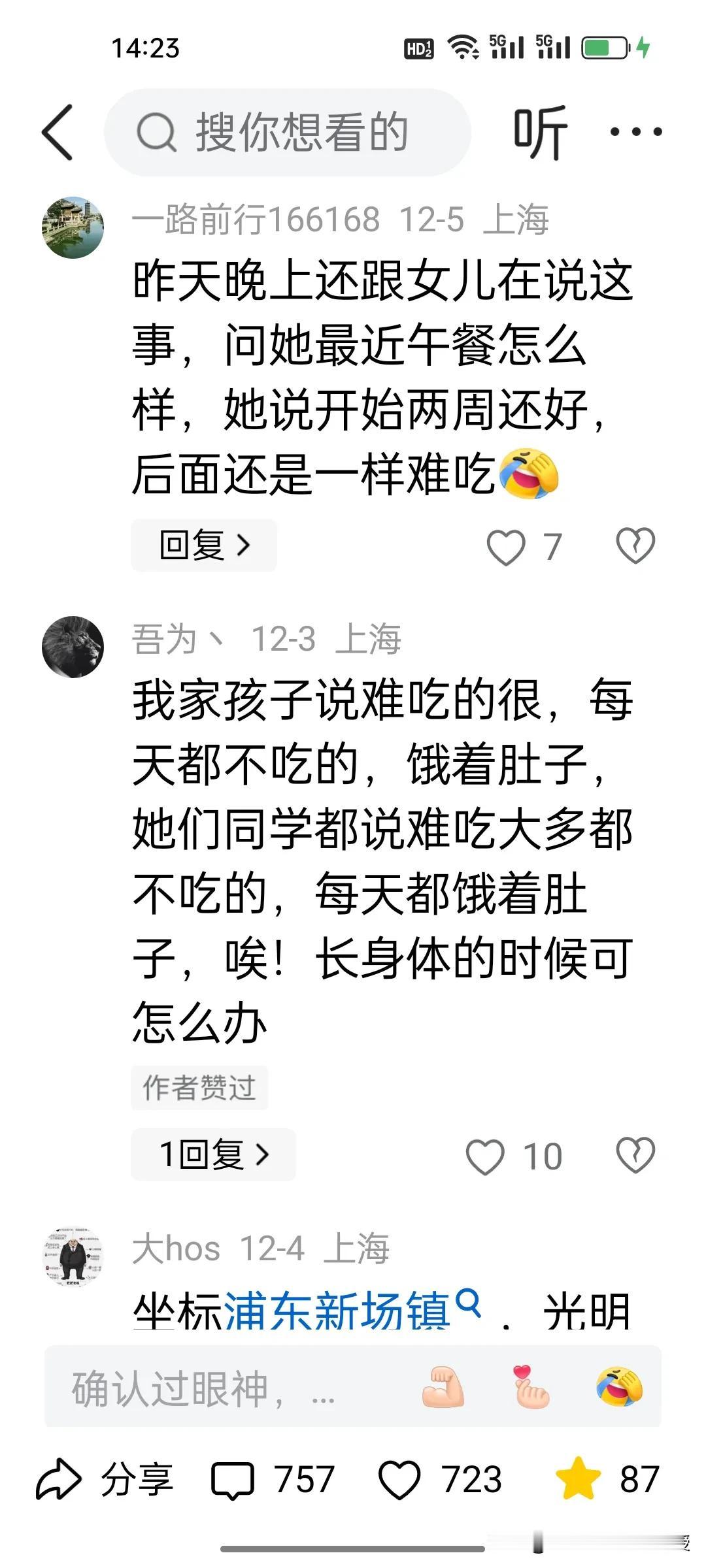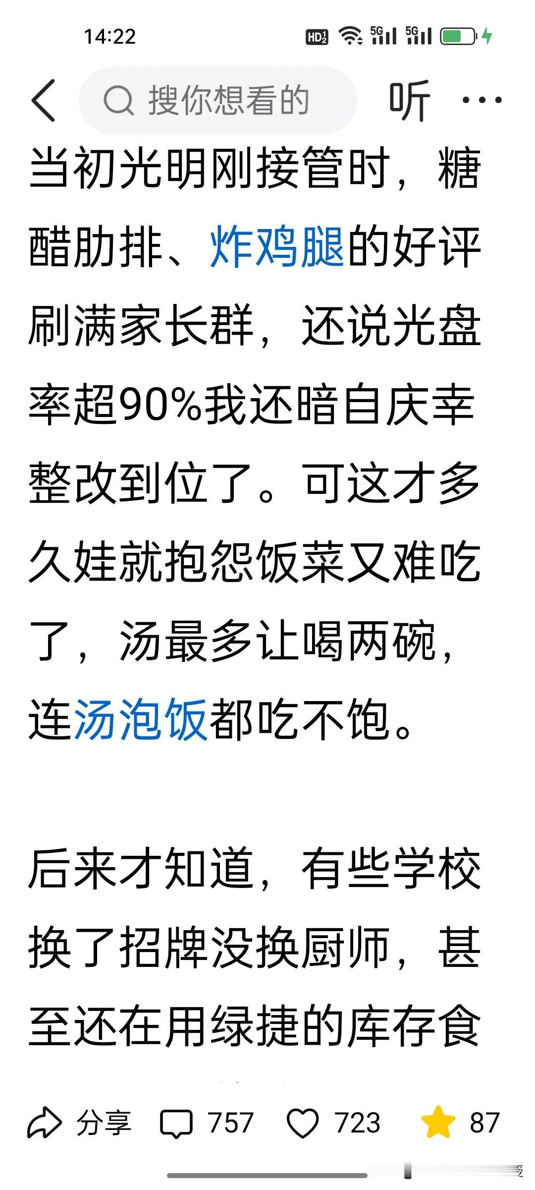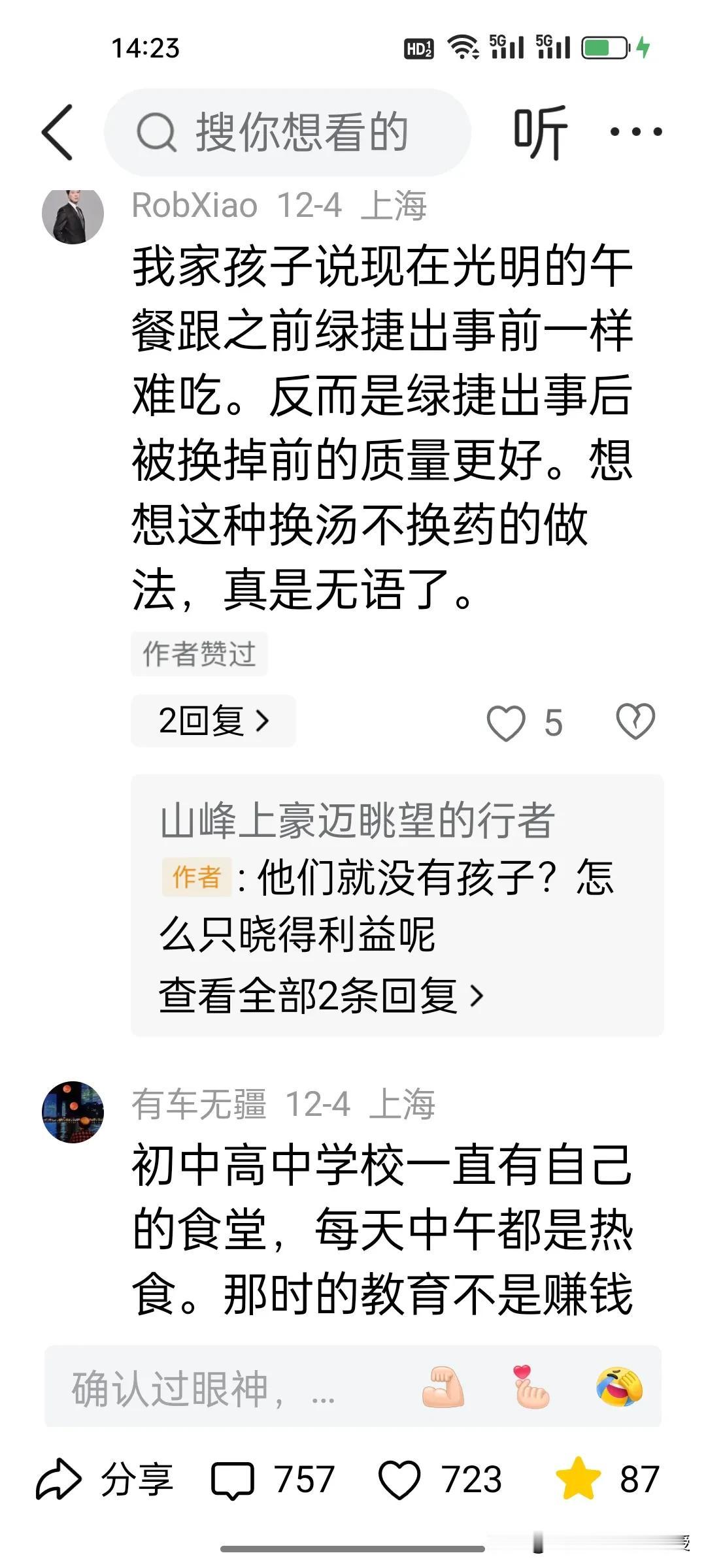 上海绿捷公司被吊销执照,负责人被逮捕后,上海中小学的午餐质量改善了吗? 绿捷公司的处理可谓是大快人心。大家都以为光明公司接管后,上海中小学生的伙食水平应该提高了,可是看下图评论和一位博主发文,依旧是现状不乐观啊! 其实,中小学的午餐可以人性化,让那些比较挑食的孩子可以自己带午饭,学校食堂给加热,这种传统做法并非不可。有的孩子有家里人给做饭,可以允许回家吃,也可以让家里人给送饭到学校,不能让午餐问题成为日积月累的家校矛盾,把选择权还给家庭,而不是一刀切地让学生交午餐费给学校,才是解决问题的关键。