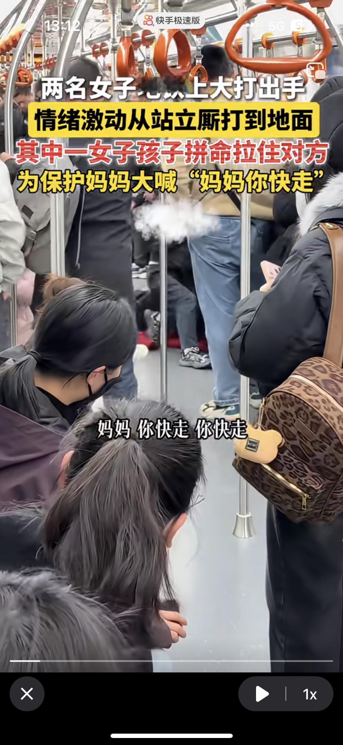 “妈妈,你快走!”在地铁上一个小女孩急促的催妈妈快点离开 在地铁上,两个女人扭打在了一起,好像是婆婆和儿媳妇儿,女儿怕妈妈受到伤害,催妈妈赶紧离开,妈妈踢了婆婆一脚,婆婆说你踢我算什么本事?女儿拼命拦住奶奶怕妈妈受到伤害 满车的人没有一个拉架,大概都觉得是家务事吧!女儿看到自己的亲人在公共场合大打出手,嘴里还说着让妈妈快走!真心疼这么懂事的孩子