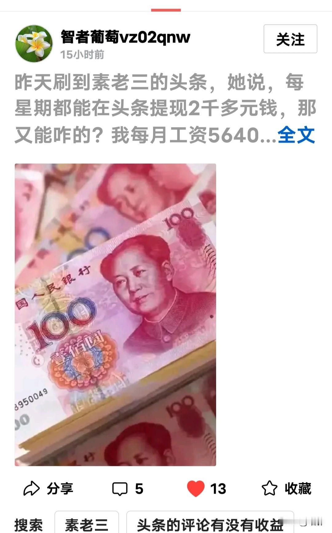 刚刚看到,网友智者葡萄写的一篇关于素老三的条文,他说素老三每星期在头条提现2000多,一个月八千,自己一个月领工资5000多,比不上素老三,而且素老三还有一个网店,一个月也五六千块钱。这位网心里很热,决心跟着素老三学习写条文,多挣点钱,争取和素老三缩短一下差距。本着学习缩短差距的心理,我点开了评论区,看到几个留言,突然看到素老三留言说:胡说八道,啥也不知道,一天天就瞎写。 他倒急了,人家是向他学习,好不好? 我赶紧在素老三的留言下写了几个字评论:只要有人信,就不是瞎写。哈哈哈! 是啊!发什么火啊,有人向他学习有什么不好呢?