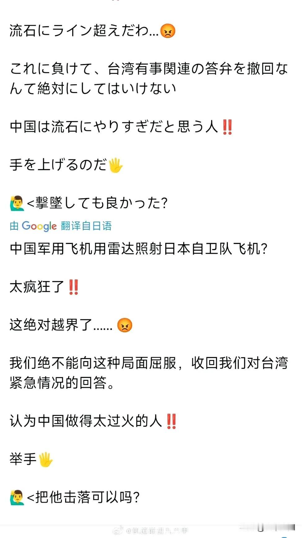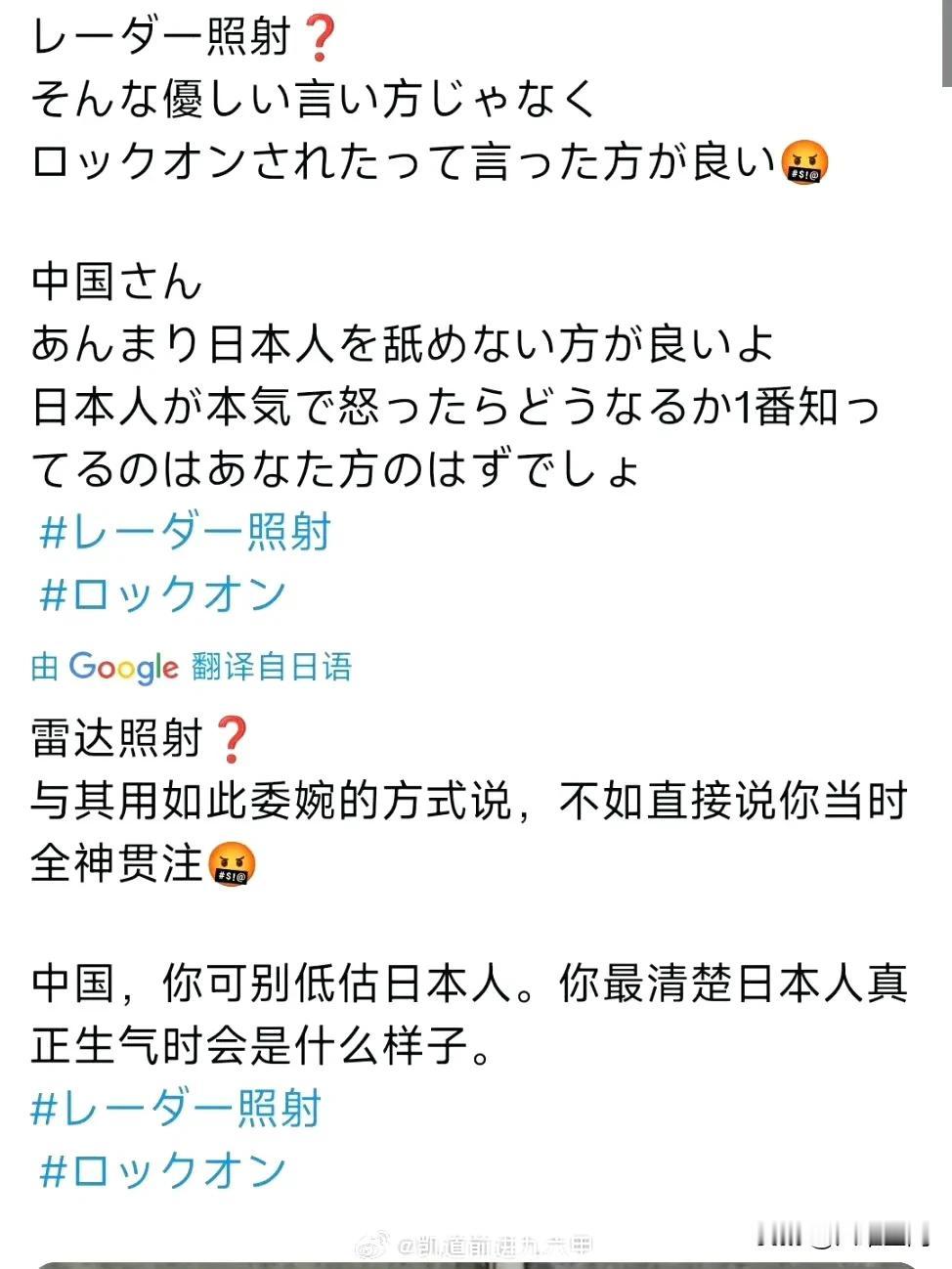 歼15雷达照射日本战机,日本网民的反应非常嚣张,有的日本网民要我们不要低估日本人,要清楚日本人真正生气时会是什么样子! 其实现在的日本人普遍都是欠揍一顿,讲道理,讲狠话已经没用了,它们比你更会讲狠话,而且这些日本人还在你的历史伤口上蹦迪,所以讲狠话已经没用了,这些日本人听不进去的,特别是年轻人的日本人,它们的思维跟当年那群日军是一样的!俄罗斯人敢做狠事,所以日本人基本不敢惹,昨天俄罗斯大使馆发推批评日本,日本网民虽然不满,但是在评论区的风格完全跟在我们大使馆账号的评论区完全不一样,日本网民对俄罗斯的批评虽然不满,但是态度还是很有礼貌,还跟俄罗斯讲道理,到我们这,它们又辱又骂,玩各种历史梗!