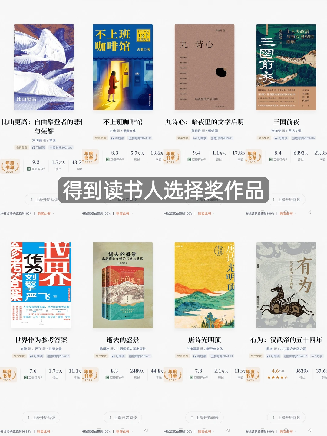 早八人谁懂啊!地铁挤成沙丁鱼罐头,但我的通勤时间却偷偷逆袭成「阅读黄金期」!打工人的时间碎片,用得到电子书拼出了超有含金量的书单✨ ㅤ 前阵子陷入「知识焦虑」,读的越多越迷茫。直到在得到刷到《世界作为参考答案》,刘擎和严飞老师一句「人生没有标准答案,世界就是参考答案」直接点醒我!两位学者的思想碰撞太绝了,难怪能拿下2025年「得到读书人选择奖」! ㅤ 这个奖真的含金量拉满!由156万电子书用户真实阅读数据打底,再经北大教授、财经主编等4位行业大佬层层把关,从海量书海里挑出8本神作👇 - 📖《比山更高》|突破人生海拔的勇气指南 📖《不上班咖啡馆》|打工人的自由生活图鉴 📖《九诗心》|古诗里藏着的人生哲学 📖《三国前夜》|历史迷必冲的冷知识宝库 📖《世界作为参考答案》|重塑认知的思维风暴 📖《逝去的盛景》|触摸历史温度的人文佳作 📖《唐诗光明顶》|六神磊磊爆笑解读唐诗江湖 📖《有为》|点燃奋斗热血的成长之书 ㅤ 打工人读书主打一个「快准狠」!我在地铁上直接开启得到「听+看+记」模式: ✅ 一边听书一边高亮划重点,下车前就能读完半本书 ✅ 遇到金句用「一键笔记」功能,自动生成读书笔记 ✅ 碰到晦涩段落,AI秒速解析还能拓展相关知识点 ✅ 想写主题书单,输入关键词直接定位书中具体段落,还能free试读10%! ㅤ 超爱得到0广'告0弹窗!在嘈杂的地铁里,终于能沉浸式啃完一本好书~蕞近用AI提炼《九诗心》精华,10分钟就吃透了古诗里的人生智慧,这效率谁懂啊!! - 宝子们!通勤路上偷来的时间,当然要读这些高含金量的好书!直接抄这份读书人亲测不踩雷的书单,每一本都是对自蕞值的投资💪冲就完事!! ㅤ
